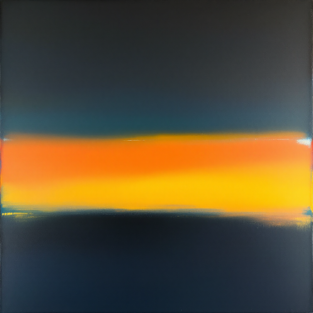 Off the eastern coast of New Zealand's North Island, where the Tasman Sea meets the Pacific, atmospheric conditions create a contemplative scene of high humidity and gentle precipitation. The extremely cold temperature anomaly of 22.5 K drives this composition toward Rothko's darker, more introspective palette of deep blues and blacks, while the very high humidity of 96% creates an inner luminosity that makes these somber colors seem to glow from within. The moderate wind from the northeast softens the boundaries between two primary color bands, as the relatively low pressure system encourages a simplified composition of heavy, enveloping forms that fill the canvas with meditative presence.