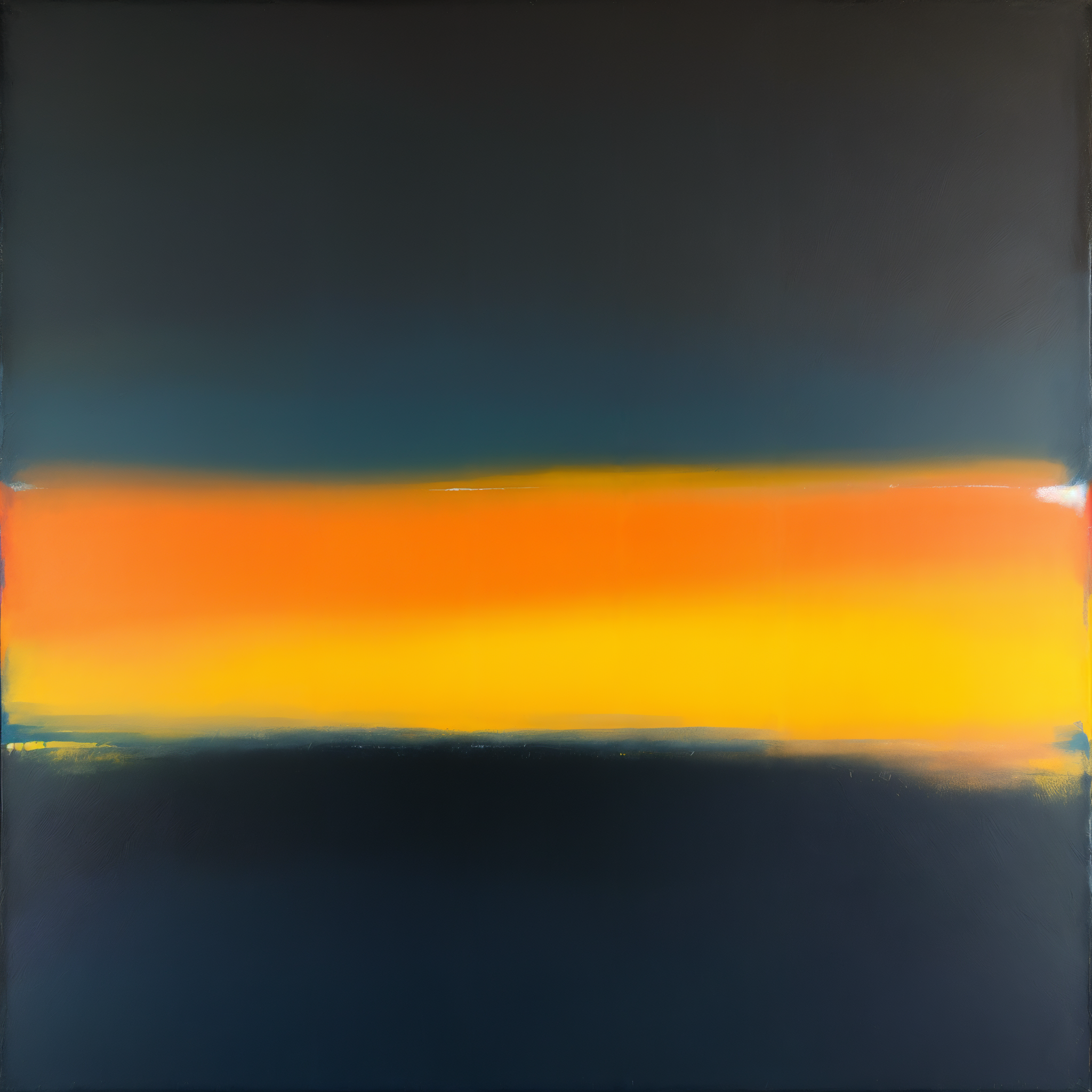 Off the eastern coast of New Zealand's North Island, where the Tasman Sea meets the Pacific, atmospheric conditions create a contemplative scene of high humidity and gentle precipitation. The extremely cold temperature anomaly of 22.5 K drives this composition toward Rothko's darker, more introspective palette of deep blues and blacks, while the very high humidity of 96% creates an inner luminosity that makes these somber colors seem to glow from within. The moderate wind from the northeast softens the boundaries between two primary color bands, as the relatively low pressure system encourages a simplified composition of heavy, enveloping forms that fill the canvas with meditative presence.