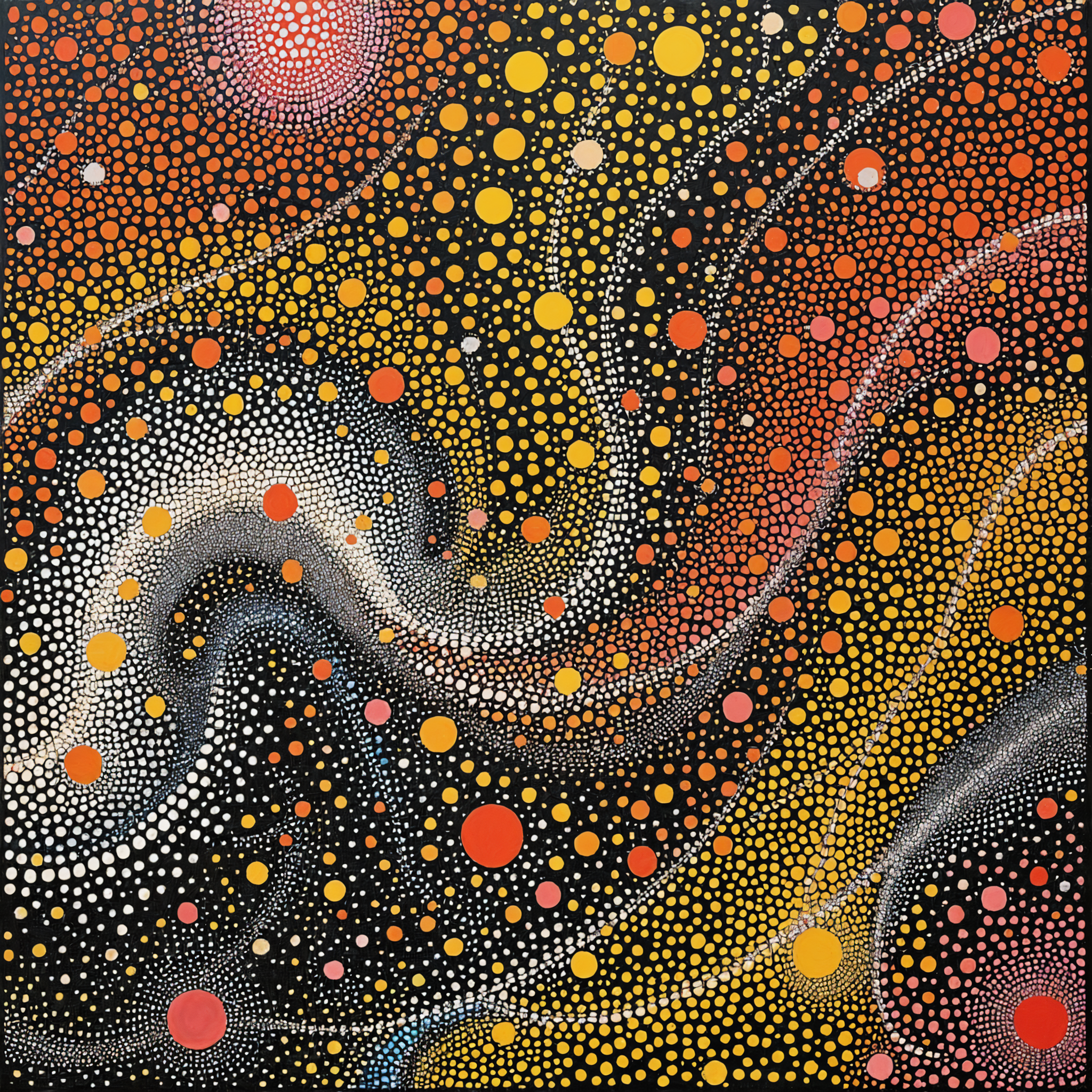 Off the eastern coast of New Zealand's North Island, where the Tasman Sea meets the Pacific, atmospheric forces create a dynamic canvas of movement and energy. The moderate wind speed of 11.5 m/s generates densely clustered dot formations that pulse across the composition like cosmic particles in motion, while the steep pressure gradient of 38.4 Pa/cell manifests as dramatic size variations from microscopic to planetary scales. The high humidity of 96% transforms into intricate infinity net patterns that weave through the space, rendered in Kusama's signature high-contrast palette of vivid yellows and deep blacks, with bursts of electric pink representing the atmospheric anomaly.