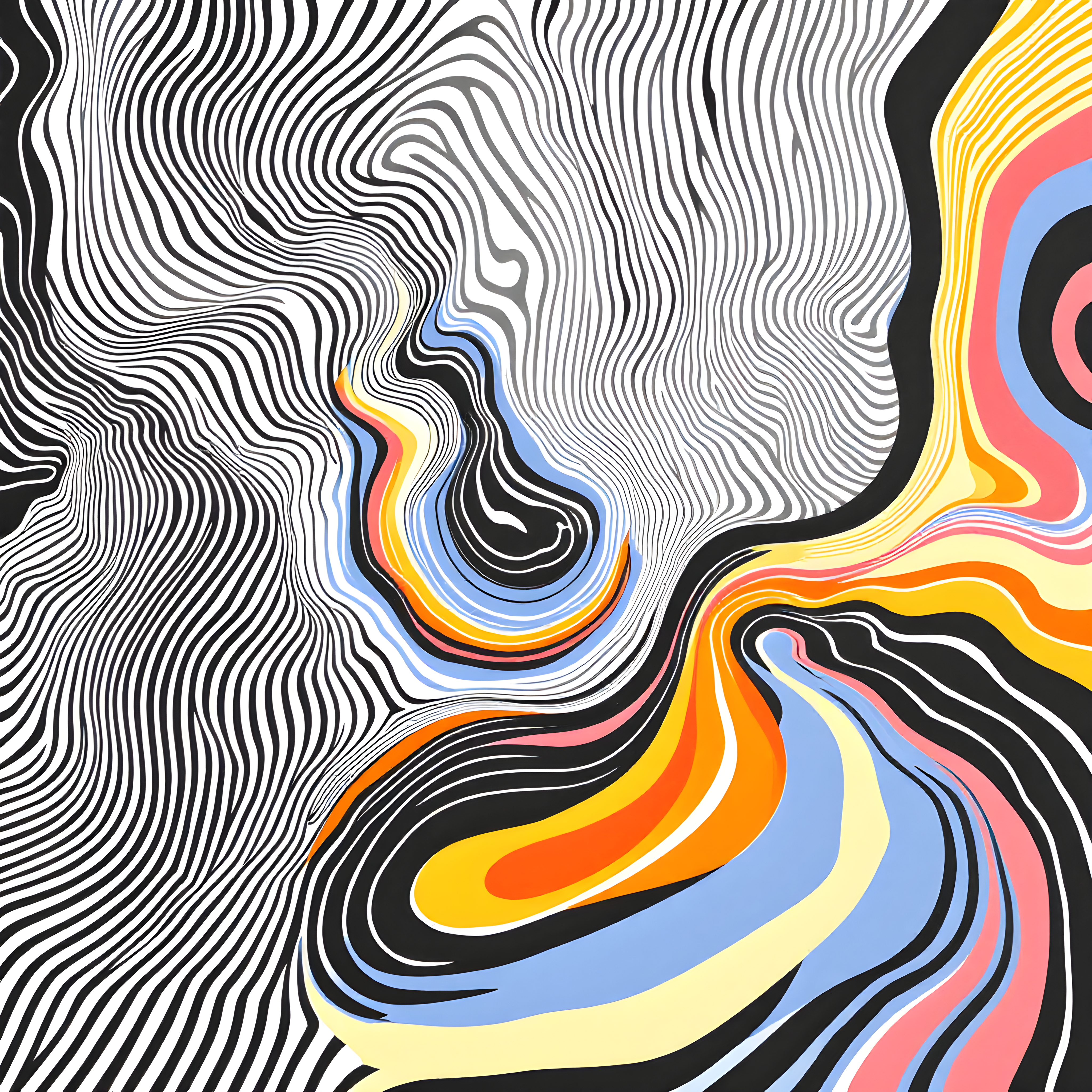 Over the Canadian Arctic archipelago in the Beaufort Sea region, this location experiences extreme atmospheric conditions with exceptionally low pressure, frigid temperatures, and near-complete humidity saturation. The minimal wind speed of 0.4 m/s from the northwest creates an almost eerily calm atmosphere, which I've interpreted through Riley's widest, most languid undulations flowing in gentle northwest-to-southeast diagonals. The brutal cold temperatures and the mathematical precision of the atmospheric data call for her early black-and-white optical work, with the steep pressure gradient translated into tightly packed parallel lines that create intense visual vibration despite the atmospheric calm.