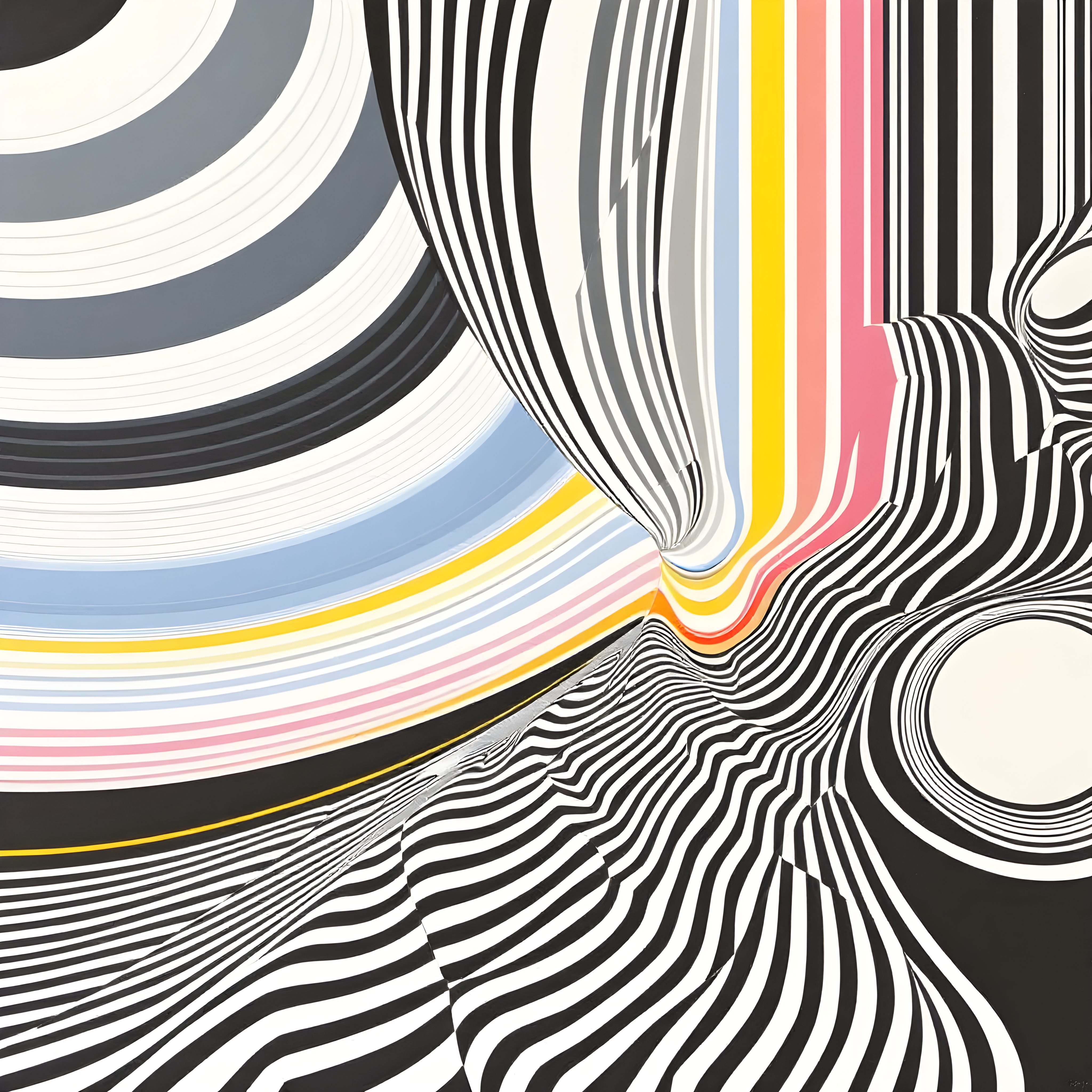 Over the Arctic Ocean at 70 degrees north, 20 degrees west, positioned between Greenland and Svalbard in the perpetual twilight of the polar region. The extreme cold temperature of -14.4 K with 100% humidity and moderate wind creates conditions for precise, crystalline optical patterns. I'm interpreting this harsh Arctic atmosphere through Riley's early black-and-white period, using the moderate wind speed to generate medium-frequency undulating stripes that flow diagonally across the canvas, with the significant pressure gradient creating densely packed parallel lines that seem to vibrate and shift like Arctic mirages.