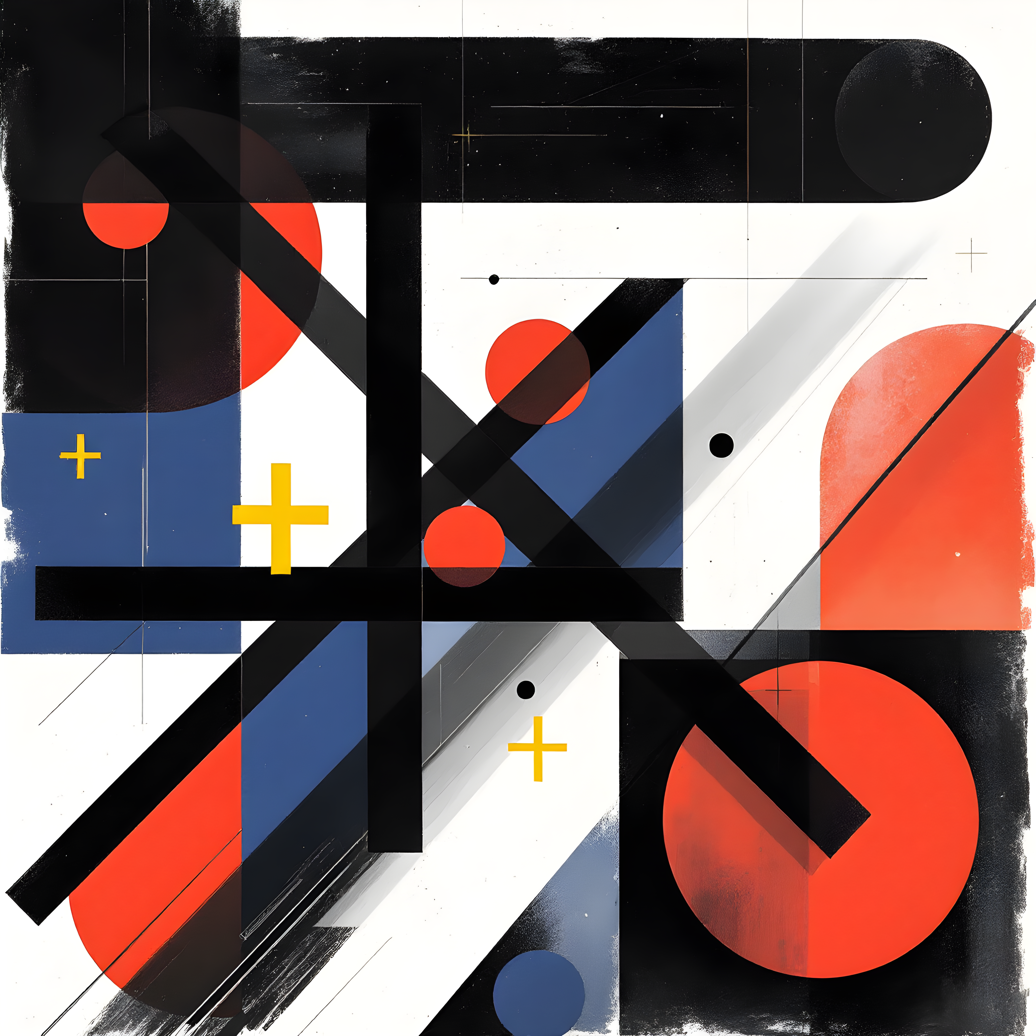 Over the high Andes of Peru and Bolivia, where tropical latitudes meet extreme altitude, the atmospheric conditions create a stark, crystalline environment. The extremely low pressure (636.8 Pa) at this high-altitude location drives a composition dominated by fewer, weightier geometric forms scattered across vast white space, while the gentle 1.8 m/s wind creates subtle diagonal arrangements rather than dramatic tilts. The cold temperature of 4.4 K despite the tropical latitude translates into a palette of deep blacks and blues, with the high humidity adding density to the scattered suprematist elements.
