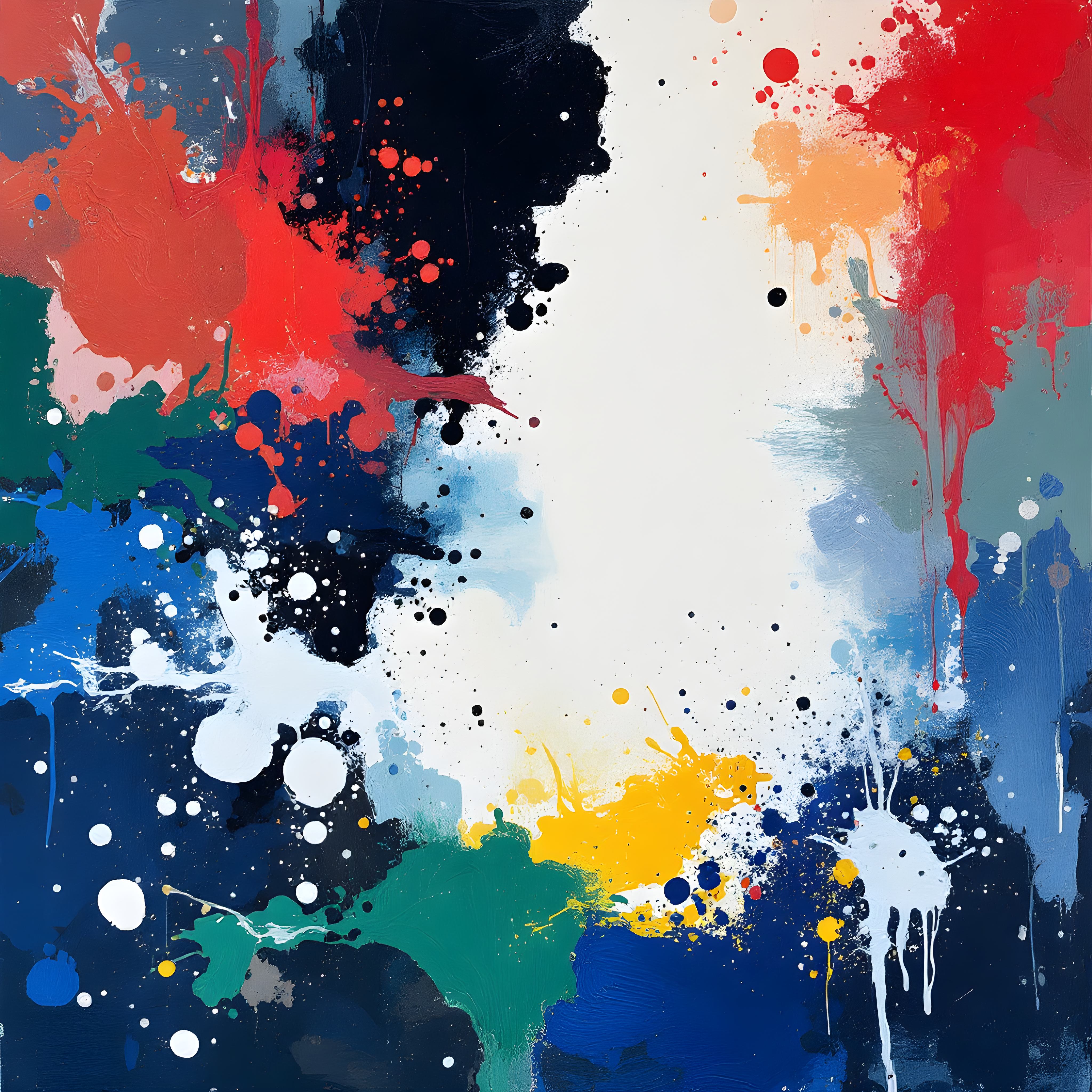 Over the Arctic Ocean north of Siberia at 60°N 90°E, where the harsh polar environment meets an unusually warm temperature anomaly of 12.7K above normal, creating a dynamic atmospheric tension. The low pressure system at 985.5 Pa with its steep gradient drives my composition toward heavy color accumulation at the canvas edges, while the moderate 4.0 m/s westerly wind creates controlled but energetic splatters that don't quite reach the center. The extreme cold base temperature of 1.1K shifts my palette toward muted earth tones with icy blue accents, punctuated by the high humidity's saturated pooling effects, leaving luminous white breathing space in the composition's heart like Francis's late works.