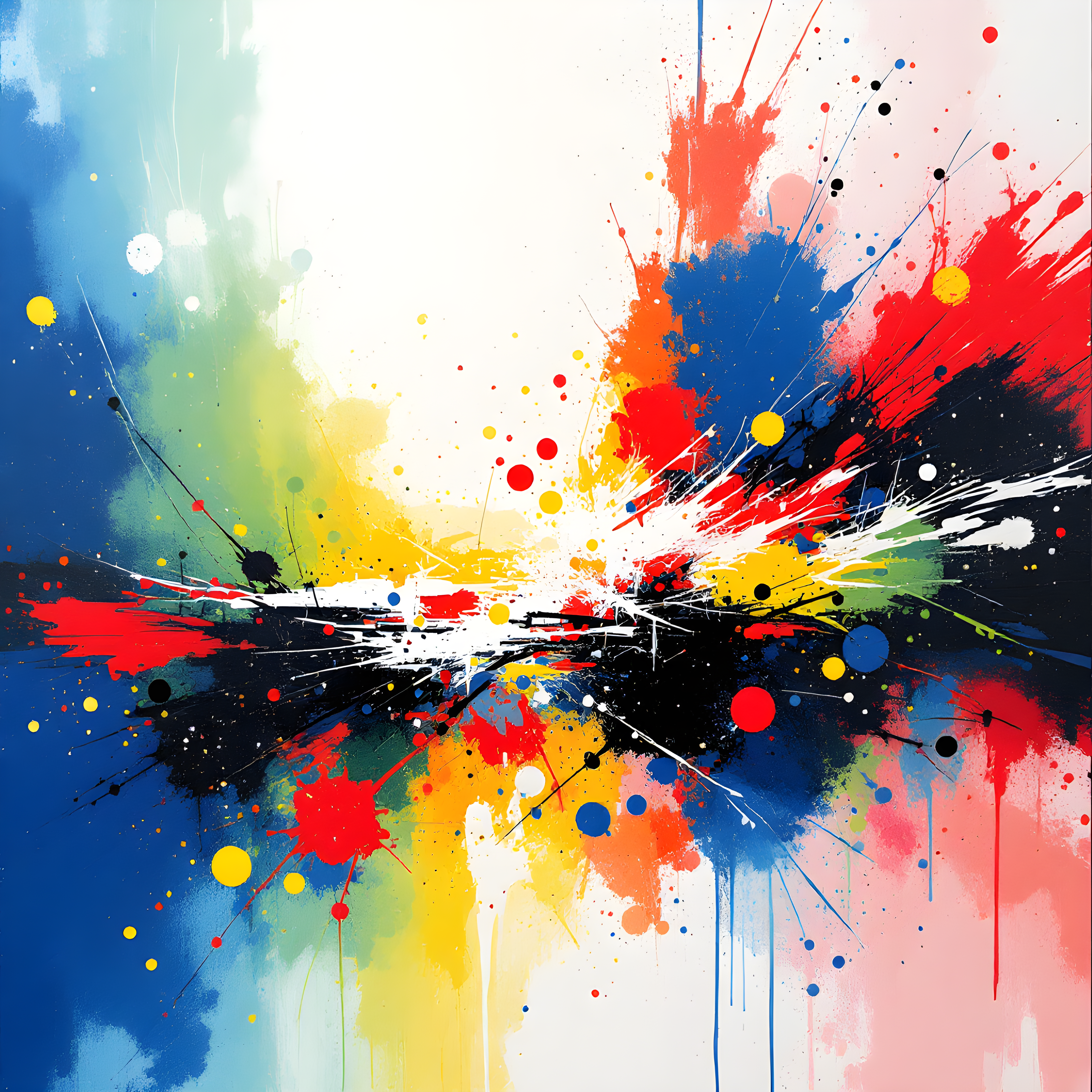 Over the waters southeast of Madagascar in the tropical Indian Ocean, moderate winds from the east-northeast drive energetic color bursts while steady sea-level pressure creates dense accumulations of saturated hues. The warm 24K temperature calls for vivid primaries - cadmium reds and ultramarine blues - while 72% humidity suggests fluid, flowing forms that pool and splatter across the canvas. The light precipitation and moderate visual interest score inspire a composition where explosive color energy radiates outward from multiple centers, leaving luminous white breathing space between the gestural marks.