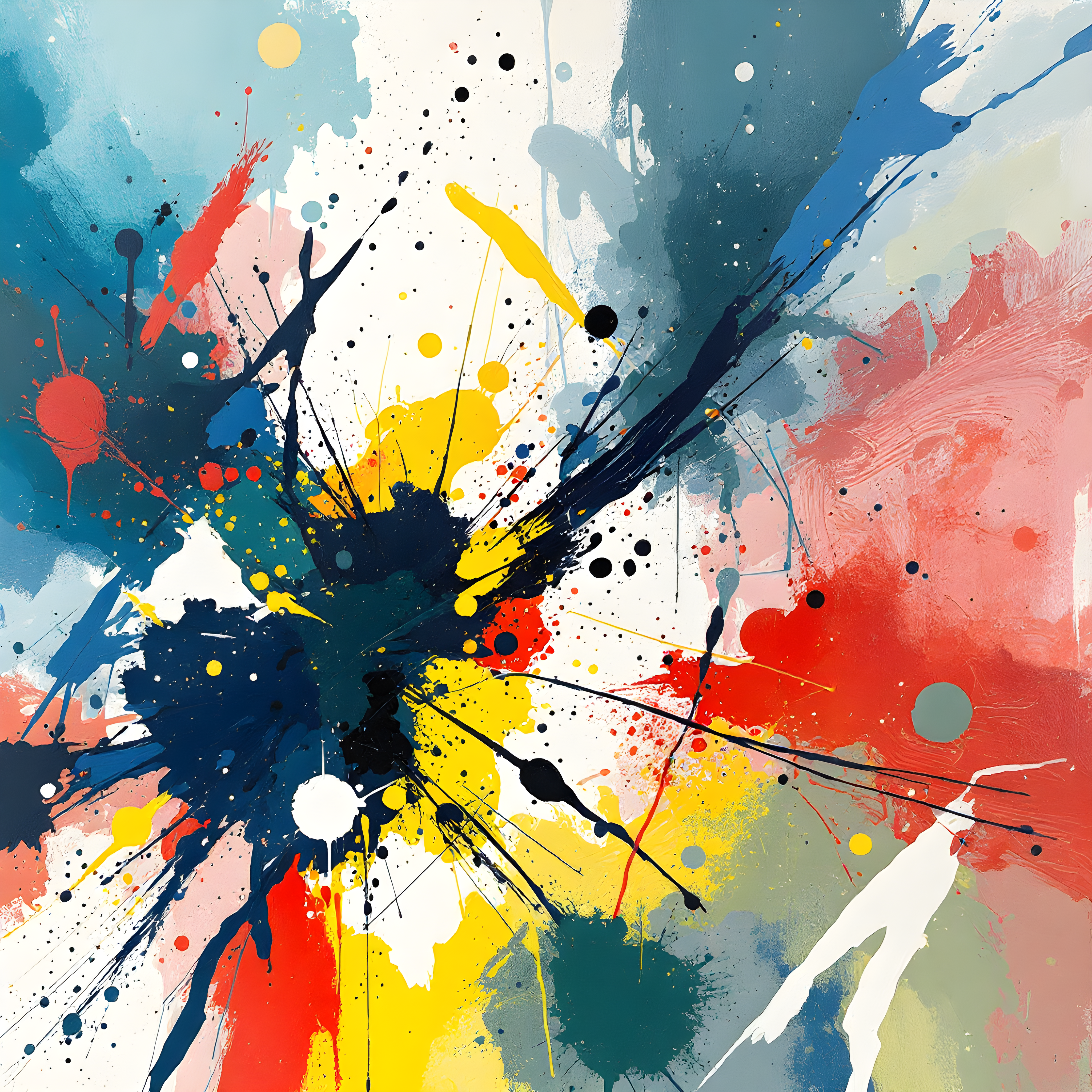 Over the Siberian Arctic Ocean, north of the Yamal Peninsula, bitter cold air meets saturated moisture in a low-pressure system. The moderate southerly wind at 9.9 m/s drives an explosive burst of muted earth tones and icy accents outward from the center, while the high humidity and low pressure create dense pools of color that accumulate at the canvas edges. The extreme cold temperature with its positive anomaly translates to a palette of frost-touched ochres, steel blues, and silvered greens that splatter and pool with gestural energy, leaving luminous white breathing space in the composition's heart.