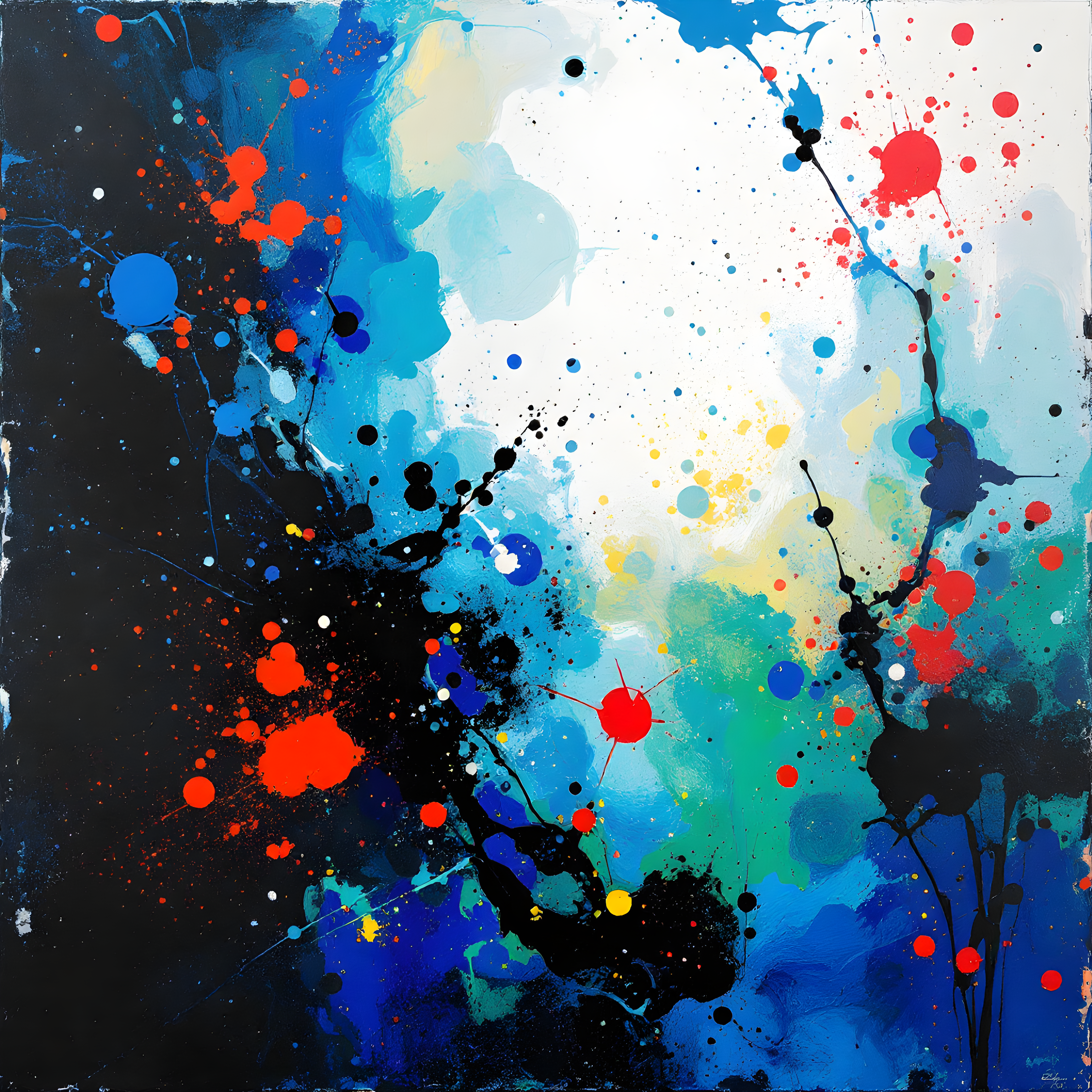 Over the vast Western Pacific Ocean northeast of Papua New Guinea, tropical conditions create a dynamic atmospheric canvas where moderate winds and high humidity generate energetic weather patterns. The moderate sea-level pressure and warm temperatures with significant anomaly inspire bold color accumulations at the canvas edges, while the easterly wind at 7.5 m/s drives gestural splatters and organic color bursts radiating outward from concentrated pools. The high humidity and light precipitation manifest as overlapping transparent washes that blur boundaries between saturated color fields, creating the luminous negative space characteristic of Francis's lyrical abstractions.