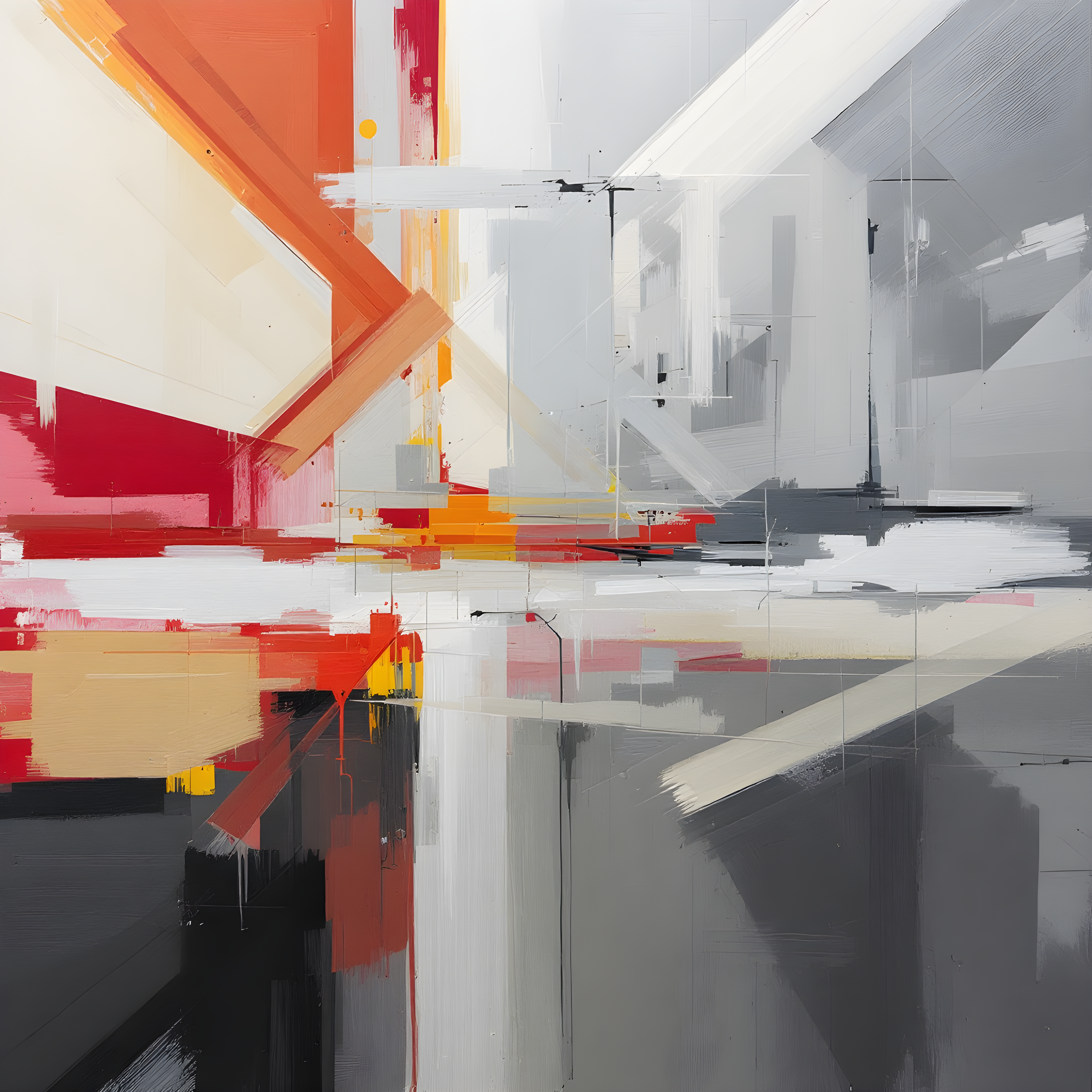 Over the equatorial Atlantic Ocean at the Prime Meridian and 30 degrees west longitude, where warm tropical waters meet variable atmospheric pressures, this piece interprets the moderate wind patterns and high humidity through Richter-inspired layered paint drags. The significant temperature anomaly of 12.5K above the zonal mean drives the revelation of warm underlying colors—deep reds and yellows—beneath cooler surface layers of greys and muted greens. The light northeasterly wind at 3.4 m/s creates gentle diagonal sweeps from upper right, while the moderate pressure gradient reveals multiple paint layers through varied opacity and overlapping strokes.