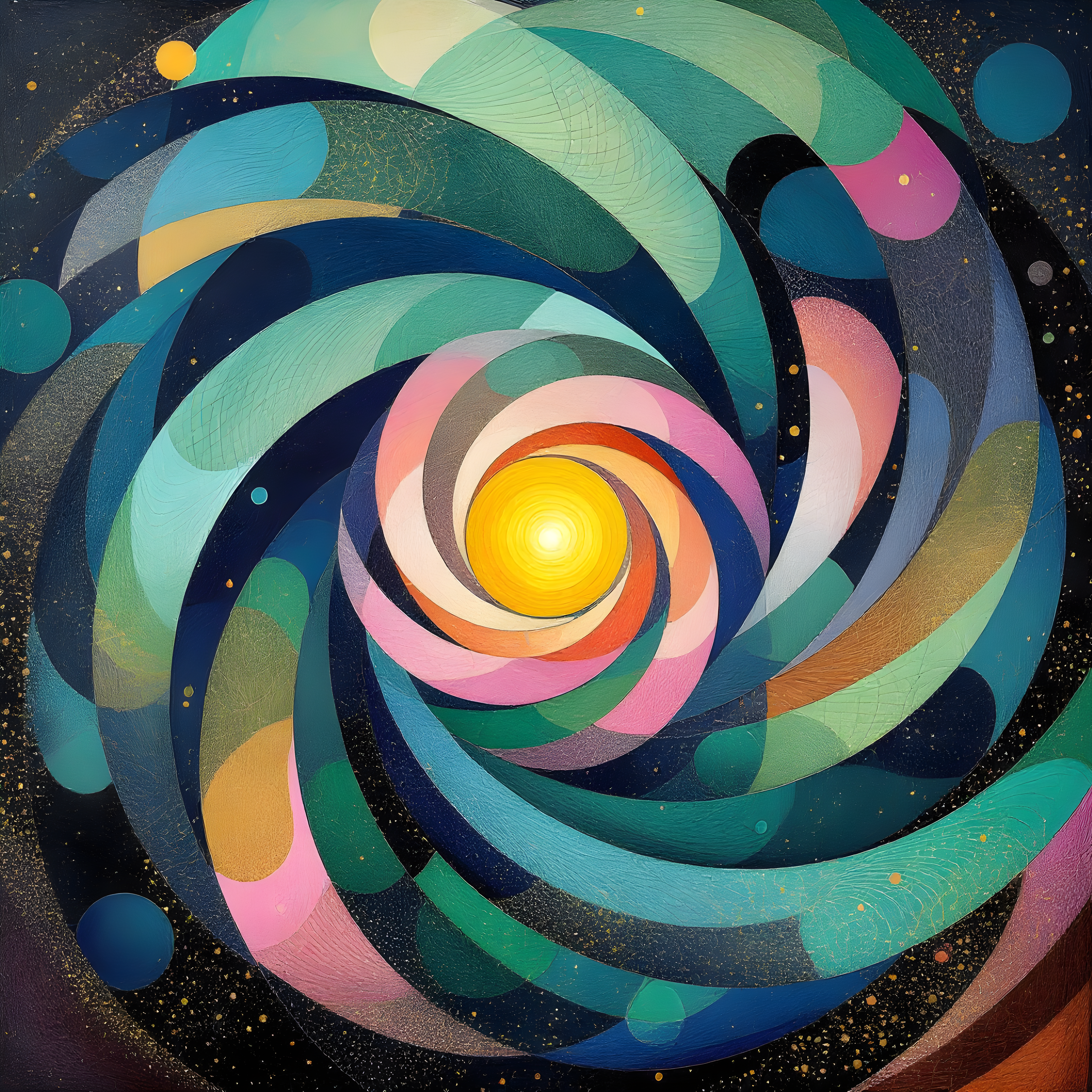 Over the Greenland Sea in the high Arctic, where icebergs drift beneath the aurora borealis, this location experiences moderate atmospheric pressure with gentle winds from the northwest and extremely high humidity approaching saturation. The cold temperature with its significant positive anomaly suggests unusual warming patterns, while minimal precipitation creates a misty, ethereal atmosphere. I've interpreted these conditions through Hilma af Klint's mystical lens: the moderate pressure manifests as medium-scale sacred circles and spirals, the gentle wind creates softly rotating forms, the cold drives a palette dominated by ethereal pastels with touches of sacred gold, and the near-complete humidity transforms geometric forms into flowing, organic botanical shapes that seem to breathe and pulse with life.