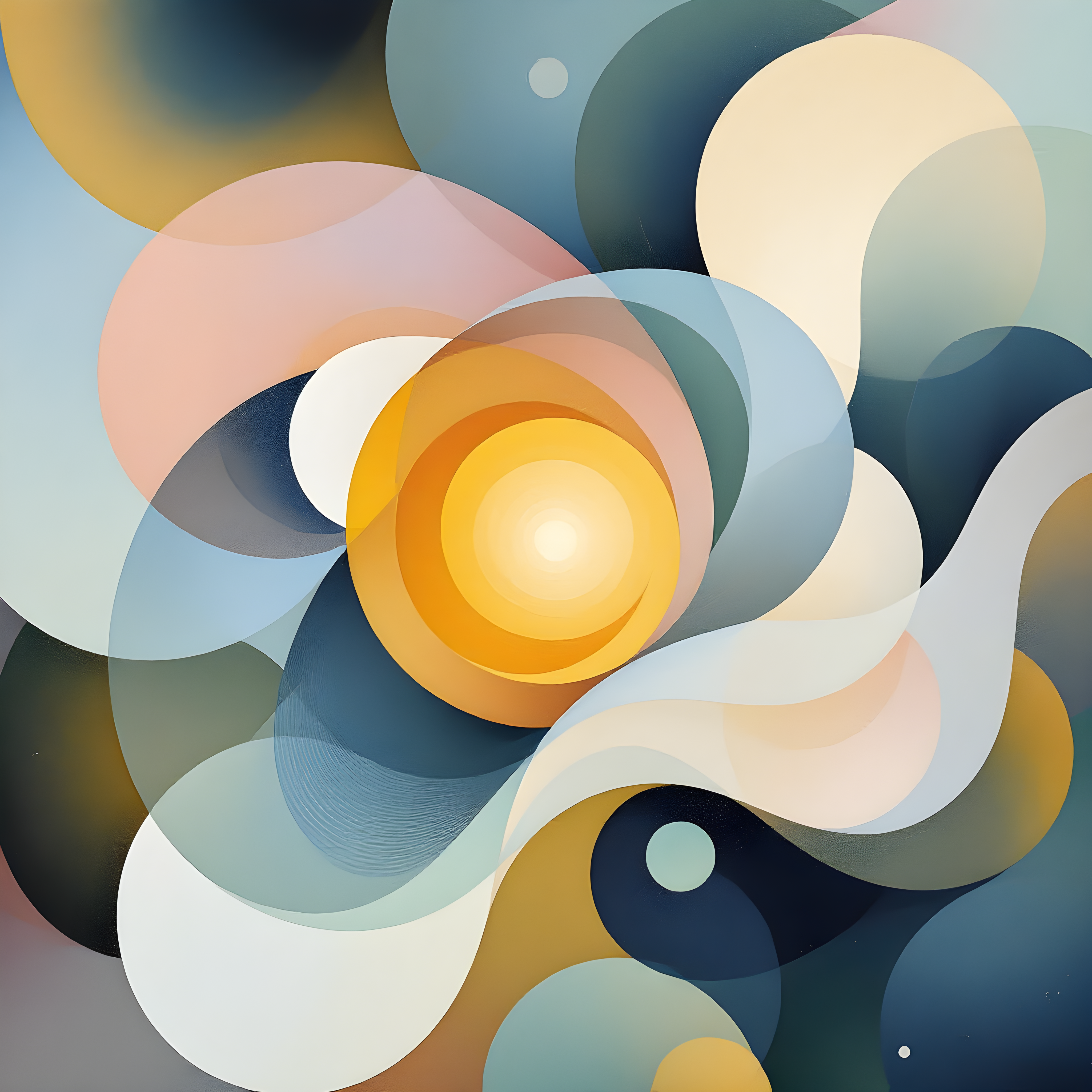 Over the Atlantic Ocean east of the Bahamas, where the warm Gulf Stream meets cooler northern waters, high pressure creates a zone of mystical clarity. The very high pressure (1028.9 Pa) manifests as large, encompassing sacred circles that dominate the composition, while the moderate wind from the northeast (55 degrees at 11 m/s) generates tight, clockwise spirals within these forms. The extremely cold temperature of 18K calls for soft, ethereal pastels that suggest otherworldly spiritual realms, while the moderate humidity of 63% introduces gentle biomorphic forms that flow like underwater currents between the geometric structures.