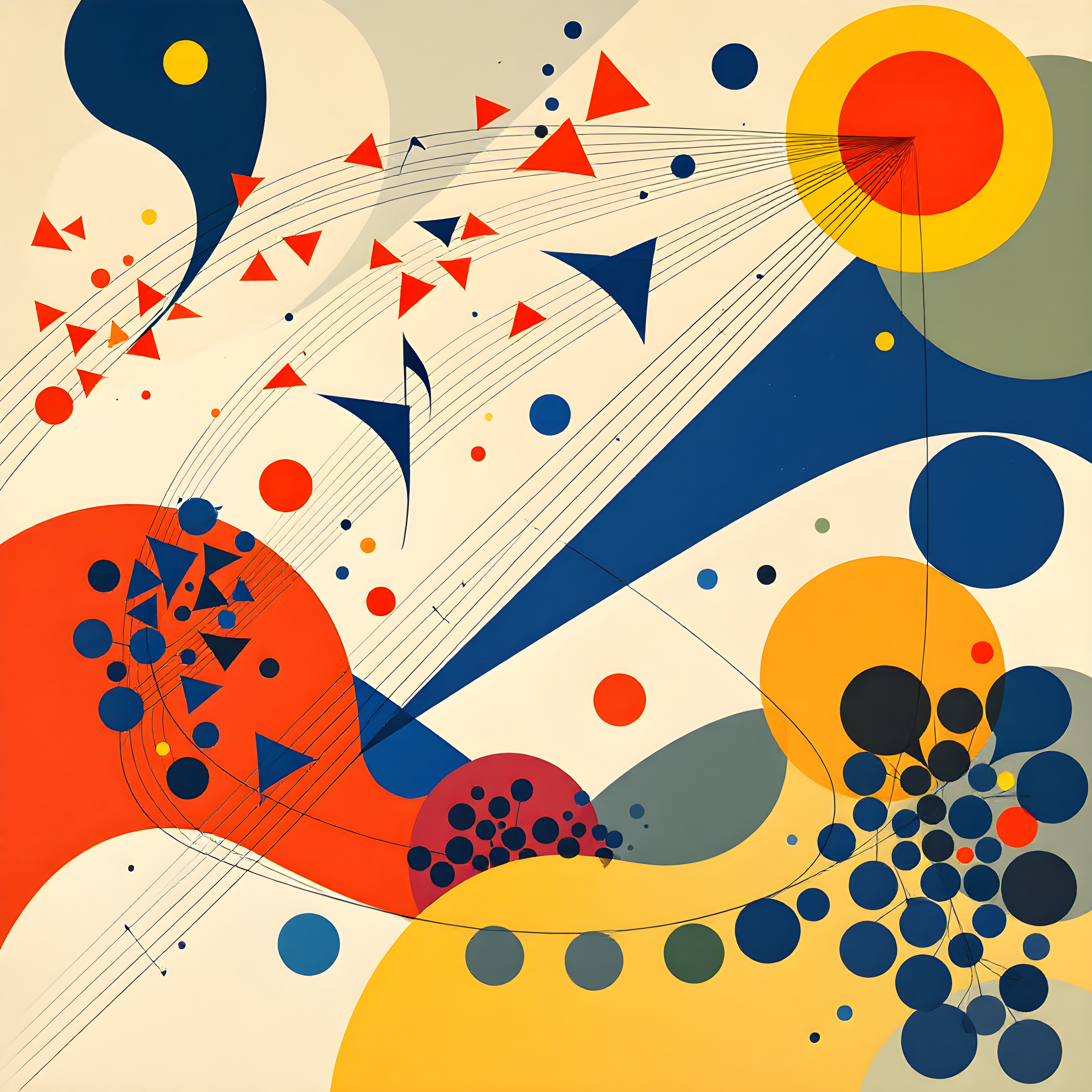 Over the Southern Ocean southwest of the Kerguelen Islands, where tempestuous winds meet the isolation of sub-Antarctic waters, the atmospheric data reveals a dynamic scene of moderate pressure and brisk northwest winds. The relatively high pressure (1012.6 Pa) lifts geometric forms toward the upper canvas like buoyant musical notes, while the strong 11.8 m/s wind from 319 degrees creates a staccato rhythm of small, energetic shapes cascading diagonally from northwest to southeast. The cold temperature of 10.6 K manifests as deep bass circles and thick rectangular forms in primary blues and blacks, punctuated by sharp triangular accents that dance across the composition like visual syncopation.