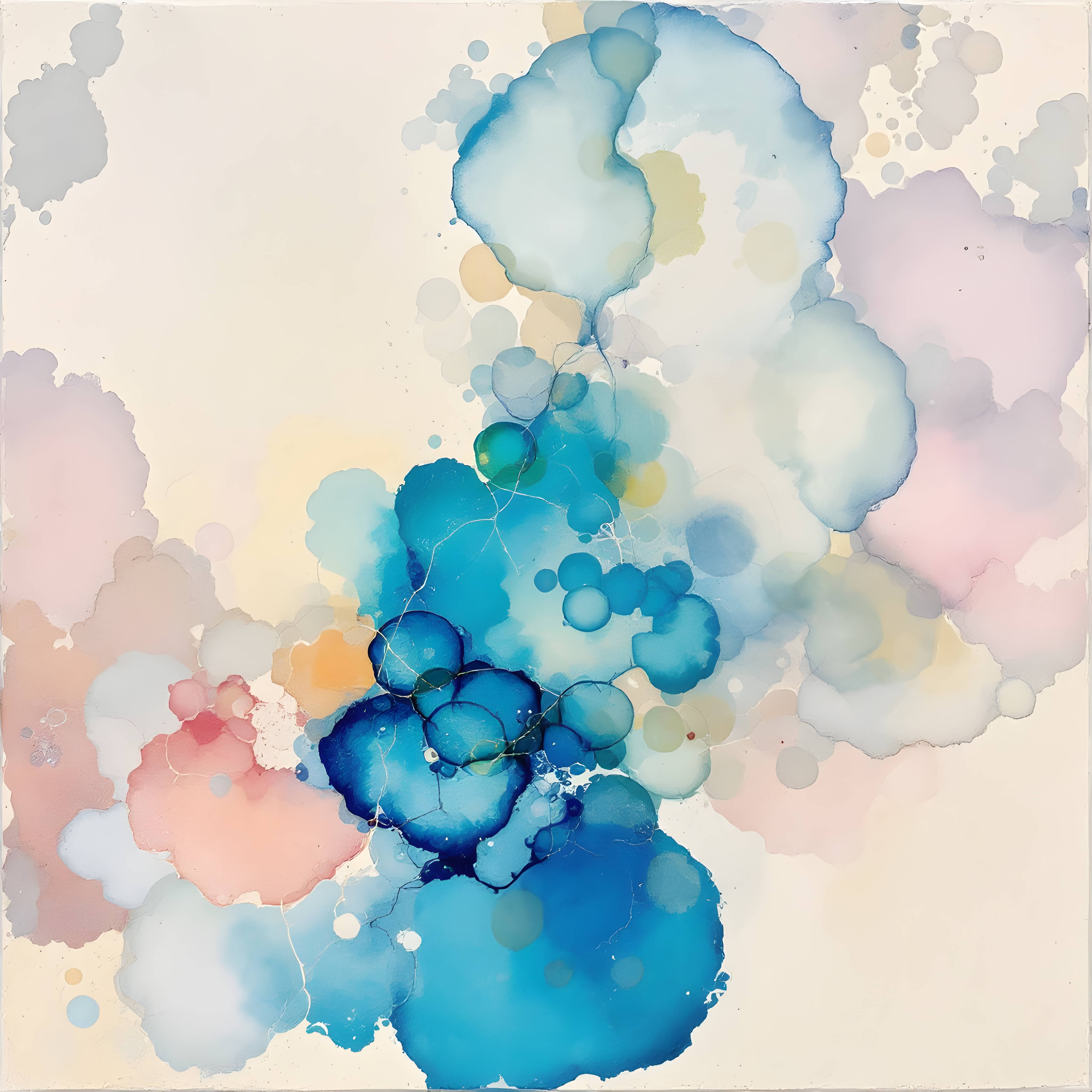 Over the Beaufort Sea in the Canadian Arctic, where extreme cold meets saturated air in an almost otherworldly atmospheric state. The brutal -17.3 K temperature creates sharp-edged pools of crystalline blues and teals, while the 100% humidity generates deep translucent layering throughout the composition. The gentle 2.0 m/s wind from the southwest spreads these frigid color stains in subtle diagonal flows, and the steep pressure gradient of 84.32 Pa/cell causes the entire field of color to tilt and cascade across the canvas like frozen aurora bleeding into arctic mist.
