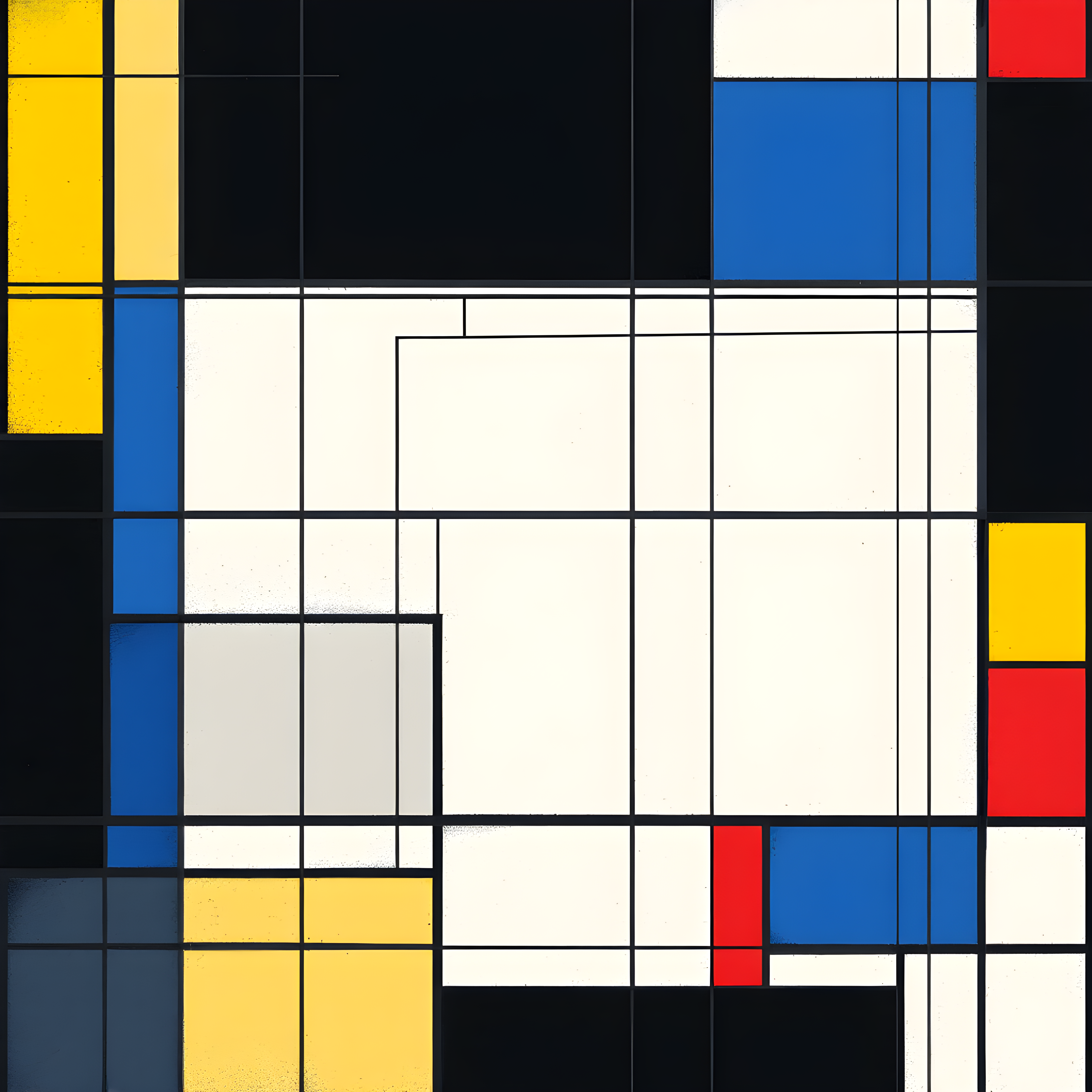 Over the tropical Atlantic waters off the coast of West Africa near the equator, where warm ocean currents meet the continental landmass, moderate atmospheric pressure with a significant gradient creates dynamic conditions. The high pressure gradient of 40.65 Pa/cell translates into a dense network of black dividing lines creating smaller rectangular cells, while the moderate temperature of 25.9K calls for yellow to dominate the composition with strategic red and blue accents. The moderate wind speed of 9.0 m/s from the east-southeast creates noticeable asymmetry pushing visual weight toward the western edge, and the high humidity of 80% demands thick, bold black lines throughout the grid system.