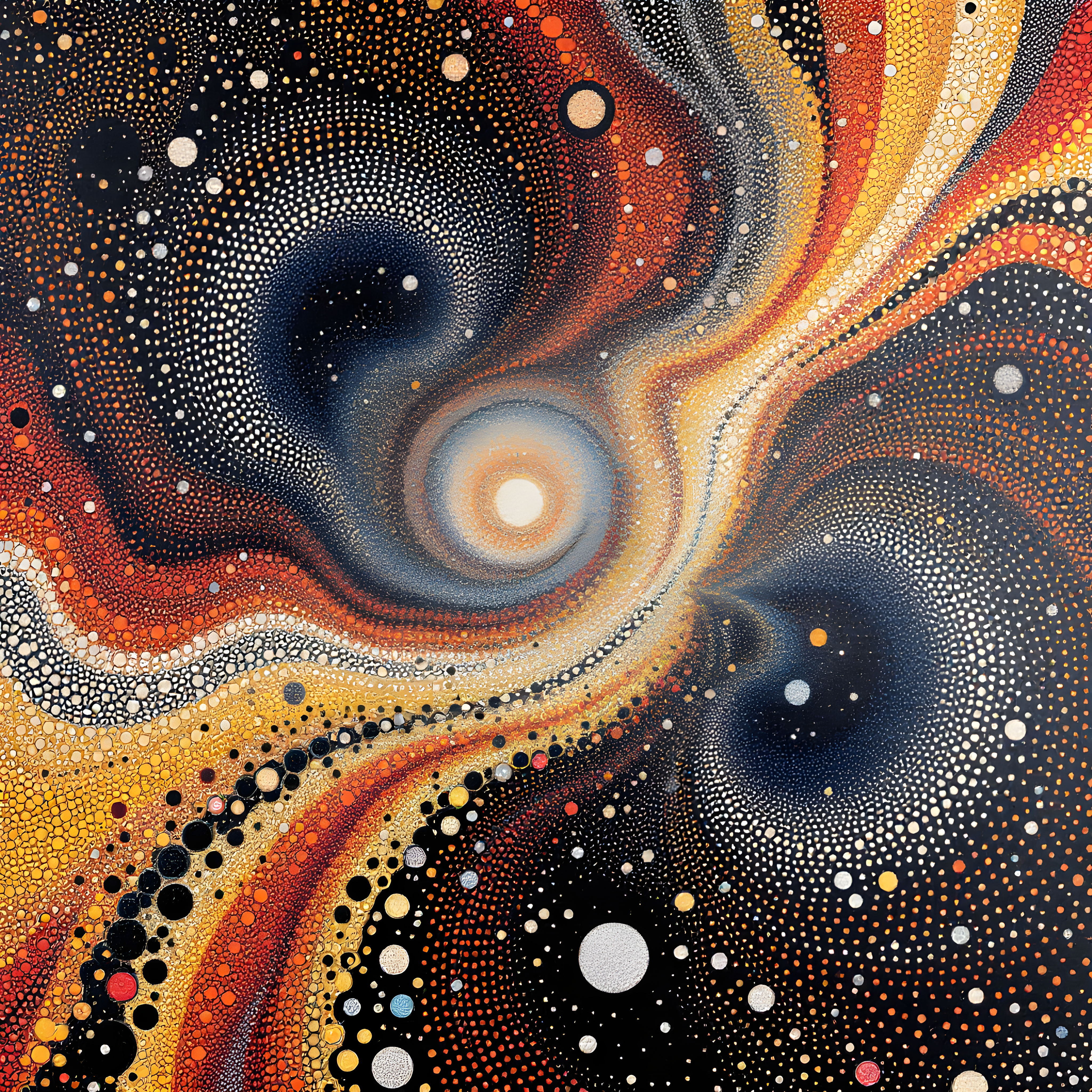 Over the tropical Atlantic waters off the coast of West Africa, where warm ocean currents meet the continental trade winds, a complex atmospheric dance unfolds with moderate wind speeds and high humidity creating dynamic conditions. The moderate wind speed of 9.9 m/s translates into densely packed dot clusters that suggest cosmic acceleration and infinite expansion, while the high relative humidity of 80% drives the creation of overlapping infinity net patterns that web across the entire canvas. The warm temperature and significant pressure gradient inspire a vivid palette of golden yellows and warm oranges against deep black backgrounds, with dot sizes varying dramatically from tiny pinpricks to large celestial bodies, embodying Kusama's obsessive repetition while interpreting the atmospheric energy of this tropical maritime region.