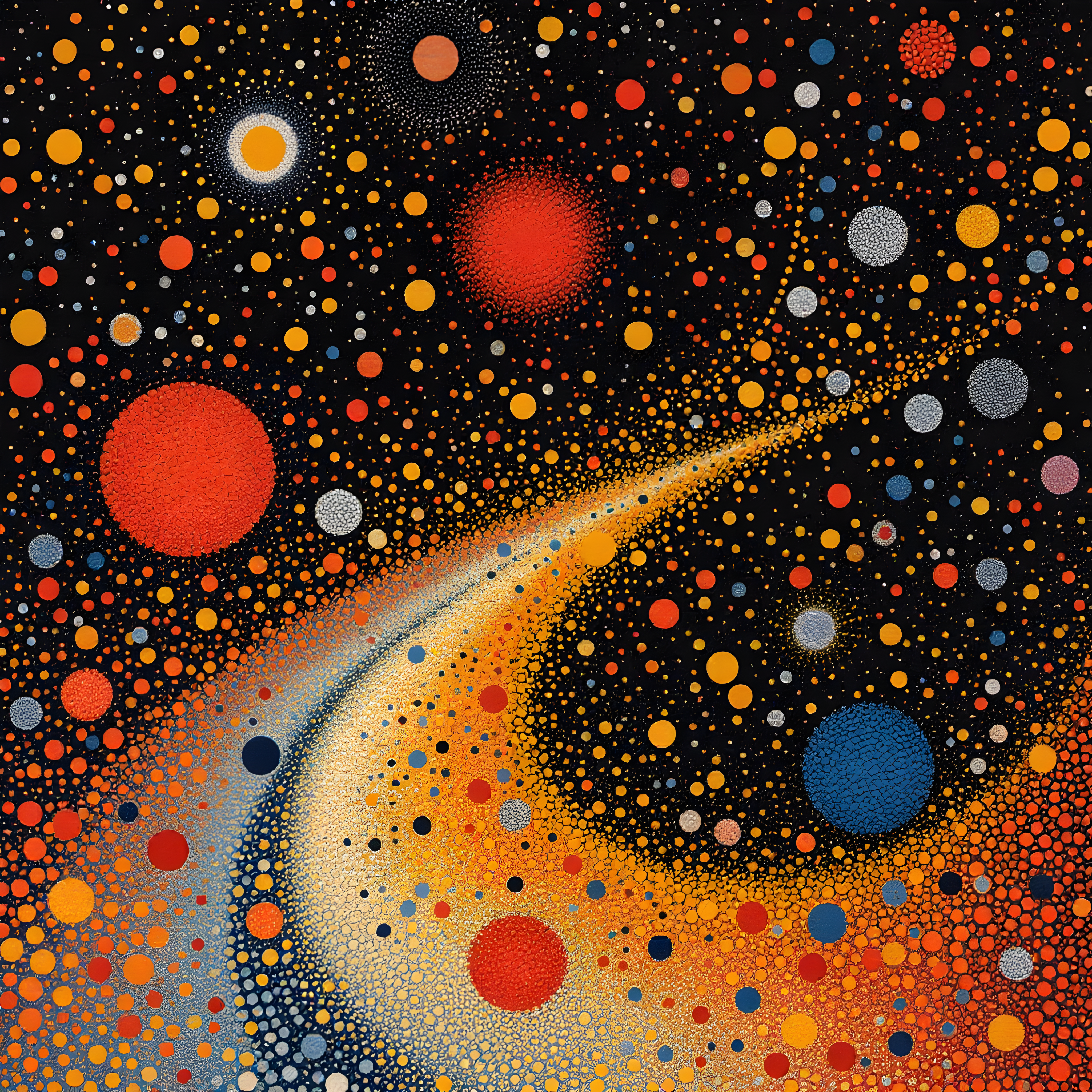 Over the vast expanse of the Western Pacific Ocean northeast of Guam and the Marshall Islands, moderate winds and high humidity create conditions ripe for Kusama's cosmic interpretation. The moderate wind speed of 10.4 m/s translates into densely clustered dots suggesting accelerated cosmic expansion, while the significant pressure gradient manifests as dramatic size variations from tiny pinpricks to bold spheres. The warm temperature with its strong positive anomaly drives a palette of vivid yellows and oranges against deep contrasting backgrounds, with the 81% humidity creating overlapping infinity net patterns that suggest the ocean's moisture-laden atmosphere.