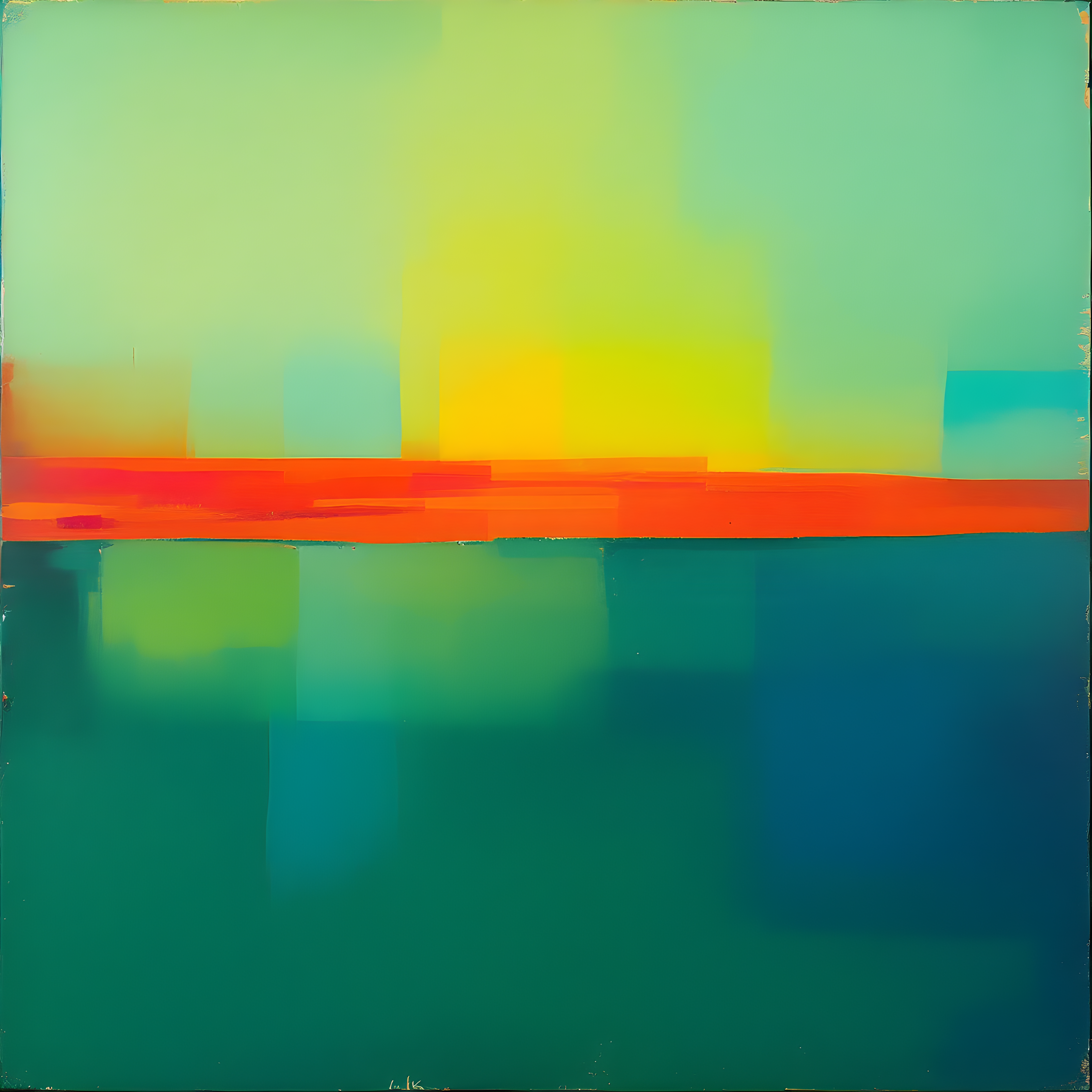 Over the remote South Atlantic waters between Argentina and the Antarctic Peninsula, cold temperatures of 3K create a deeply contemplative mood while high humidity at 85% gives the colors an inner luminosity. The moderate wind from the southwest and low pressure system inspire two primary color bands with softly vibrating edges that seem to breathe and pulse across the canvas.