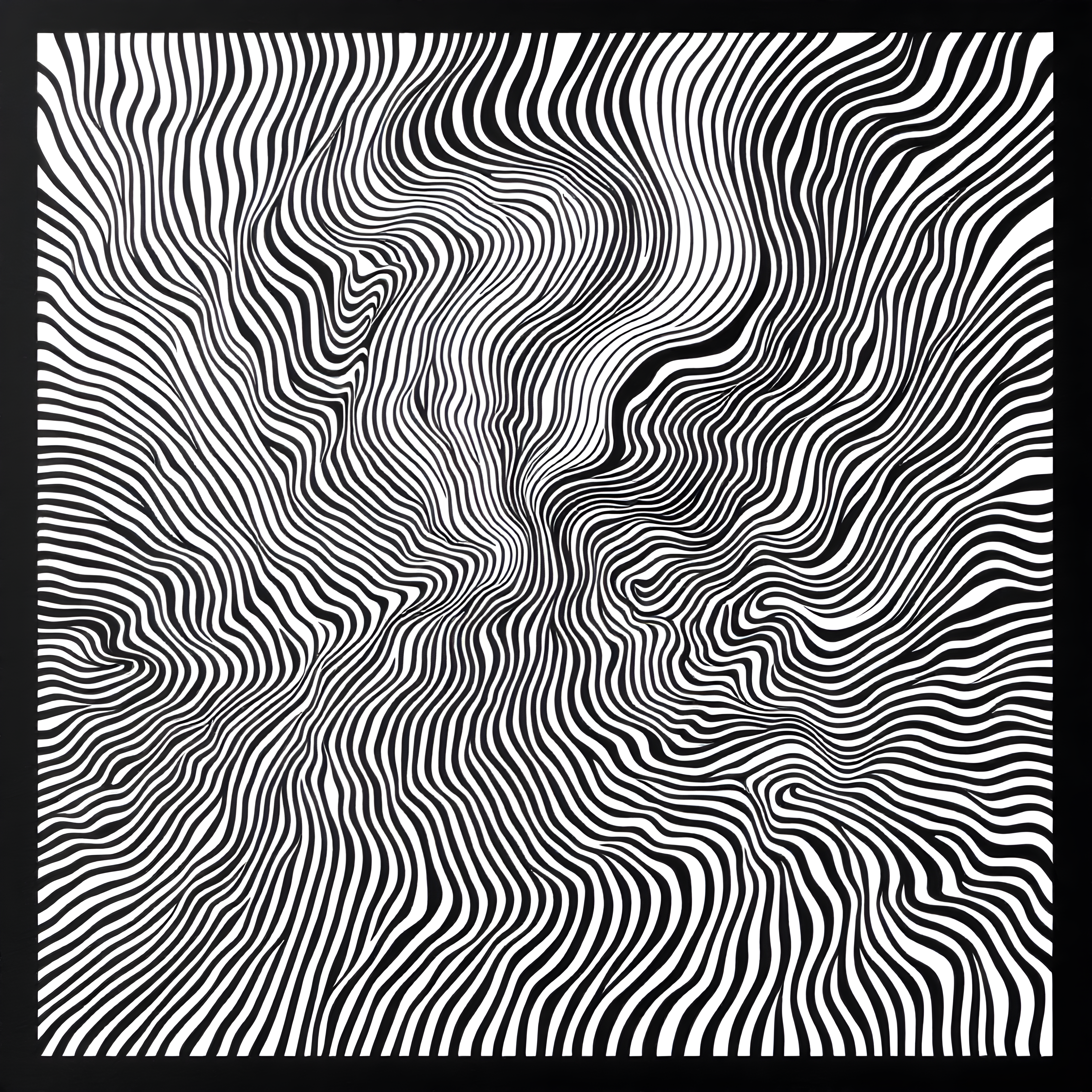 Over the North Atlantic, southwest of Ireland in the stormy waters where maritime weather systems collide, moderate winds of 12.8 m/s from the northwest create dynamic atmospheric turbulence. The significant pressure gradient of 34.7 Pa/cell combined with cold temperatures and high humidity suggests an active weather front, which I interpret through Riley's optical language as tightly packed undulating lines that vibrate with controlled intensity. The cold temperature anomaly calls for her early black-and-white period aesthetic, with the northwest wind direction driving diagonal wave patterns that create powerful optical movement across the canvas.