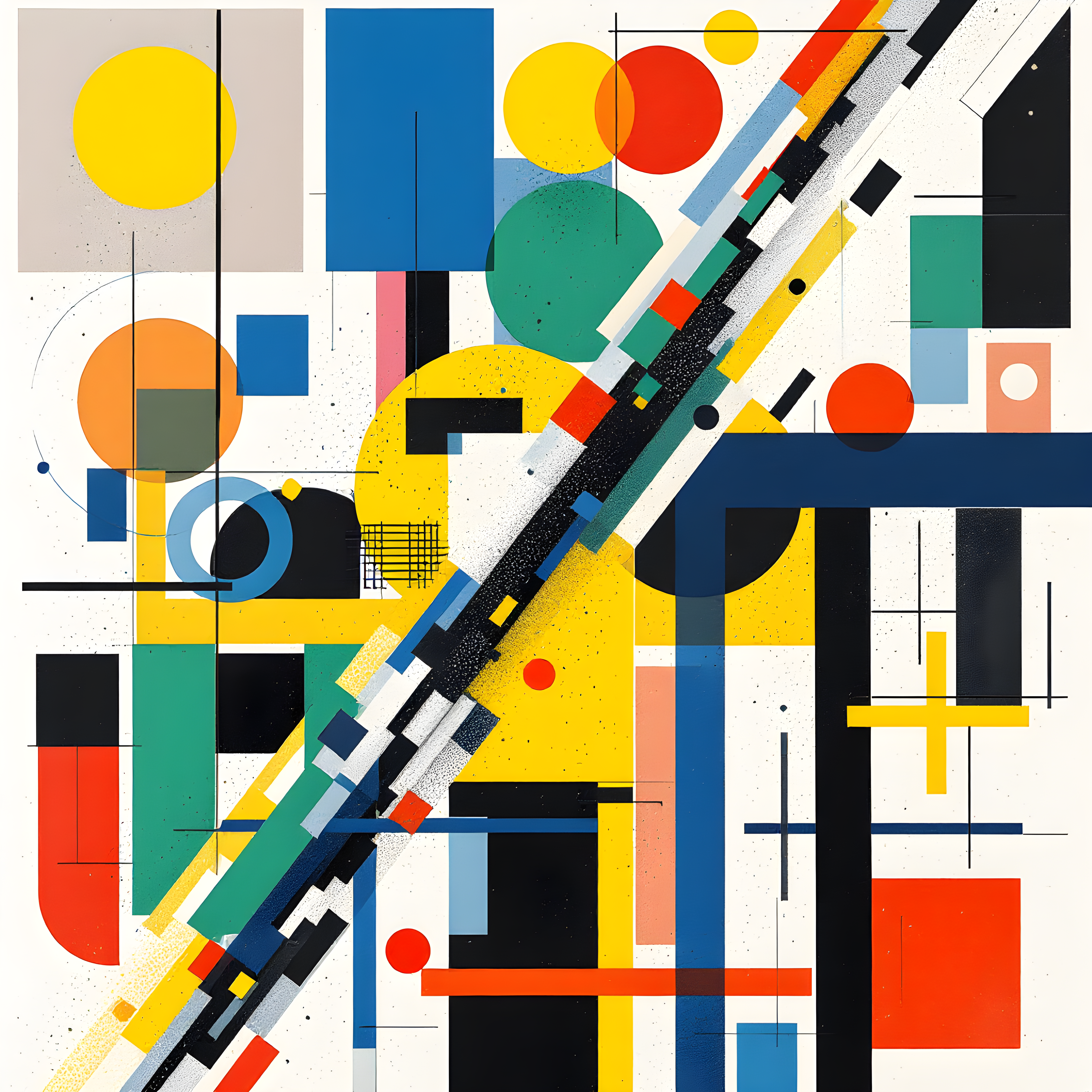 Over the vast Western Pacific Ocean, far from any landmass at 15°N 160°E, moderate winds blow from the east-northeast across warm tropical waters under high humidity conditions. The steady 12.1 m/s wind creates a dynamic diagonal energy that tilts geometric forms at sharp angles, suggesting movement and flight across the suprematist canvas. The normal sea-level pressure translates to a balanced density of shapes—neither sparse nor overcrowded—while the warm temperature of 26.6K drives the composition toward vivid reds and yellows, with the high humidity adding density to the arrangement and the absence of precipitation keeping the focus on primary geometric forms.