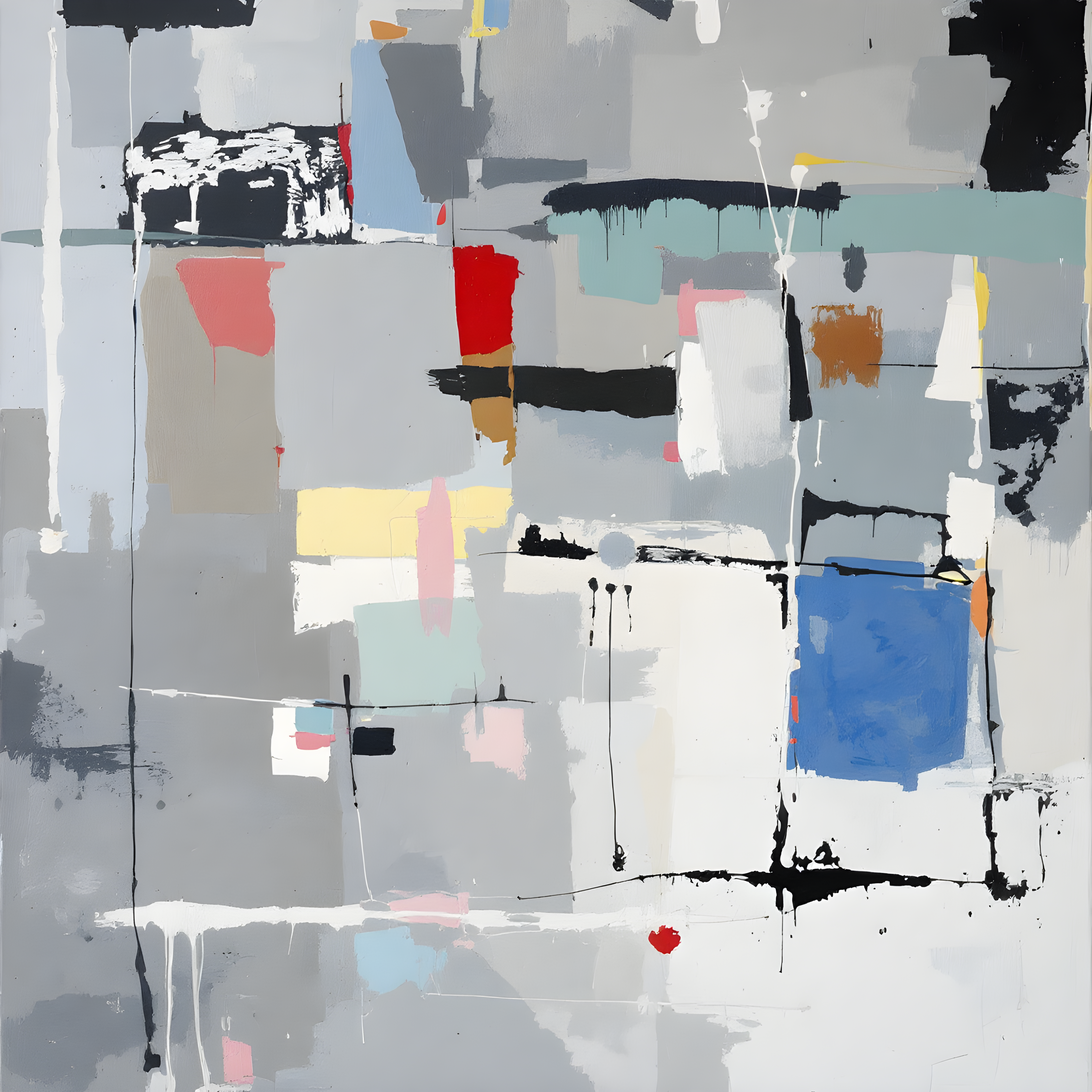 Over the Arctic Ocean at 60 degrees north latitude on the Prime Meridian, where the Greenland and Norwegian Seas meet in perpetual twilight. The significant pressure gradient creates dense archaeological layers of paint history, while the extreme temperature anomaly drives chaotic gestural marks breaking through more resolved underlying structures. The high humidity renders previous layers translucent and ghost-like, allowing decades of accumulated marks to show through, while light precipitation adds subtle drip marks suggesting the passage of Arctic time.