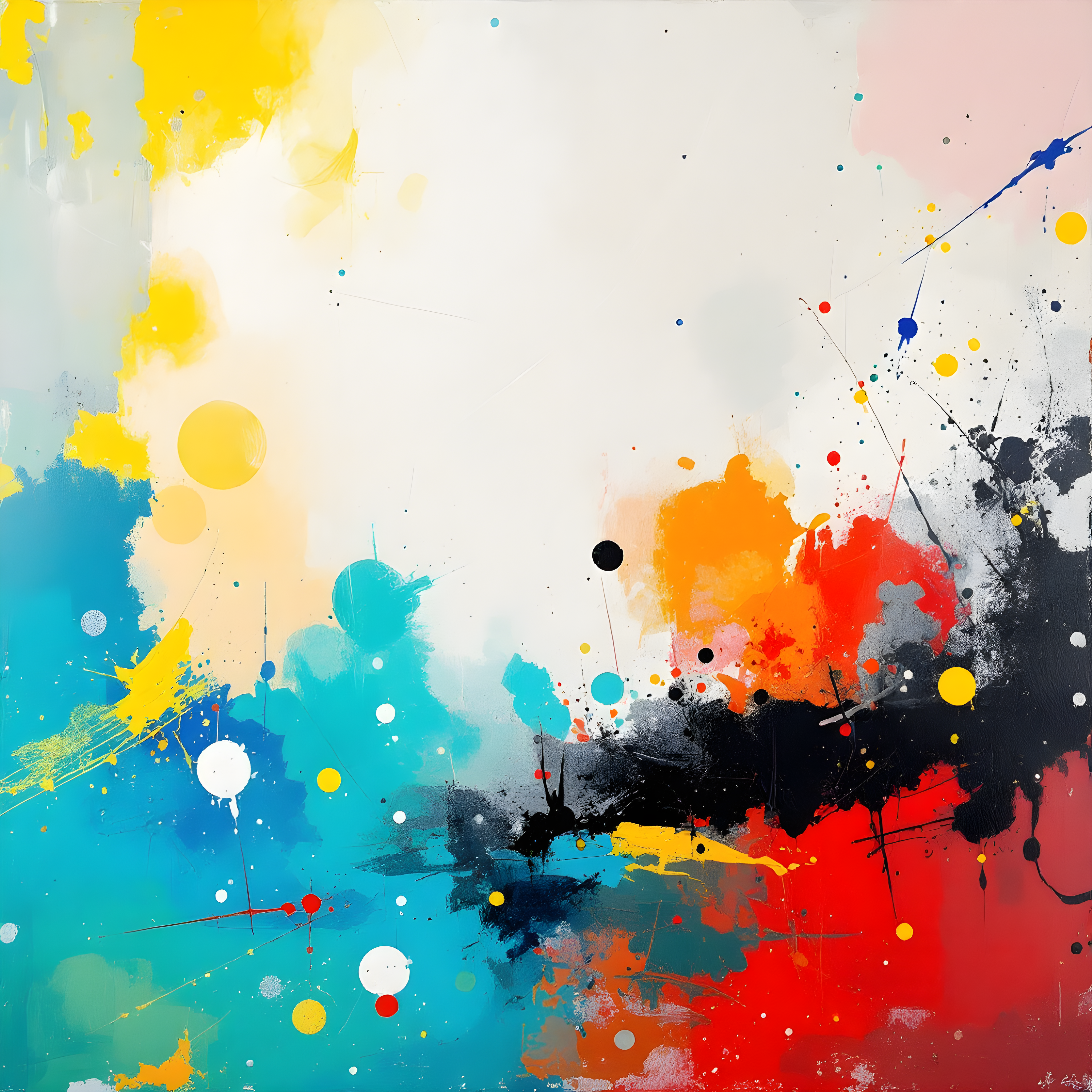 Over the Baffin Bay waters between Greenland and the Canadian Arctic Archipelago, the extreme cold creates a crystalline atmospheric tension despite the complete absence of precipitation. The moderate westerly winds and high humidity suggest moisture suspended in frigid air, while the significant positive temperature anomaly indicates this Arctic location is experiencing an unusual warming event. I've interpreted this as explosive pools of muted earth tones and icy blues concentrated at the canvas edges, with wind-driven splatters reaching inward but leaving vast luminous white space in the center to represent the stark Arctic clarity and the atmospheric pressure's organizing force.