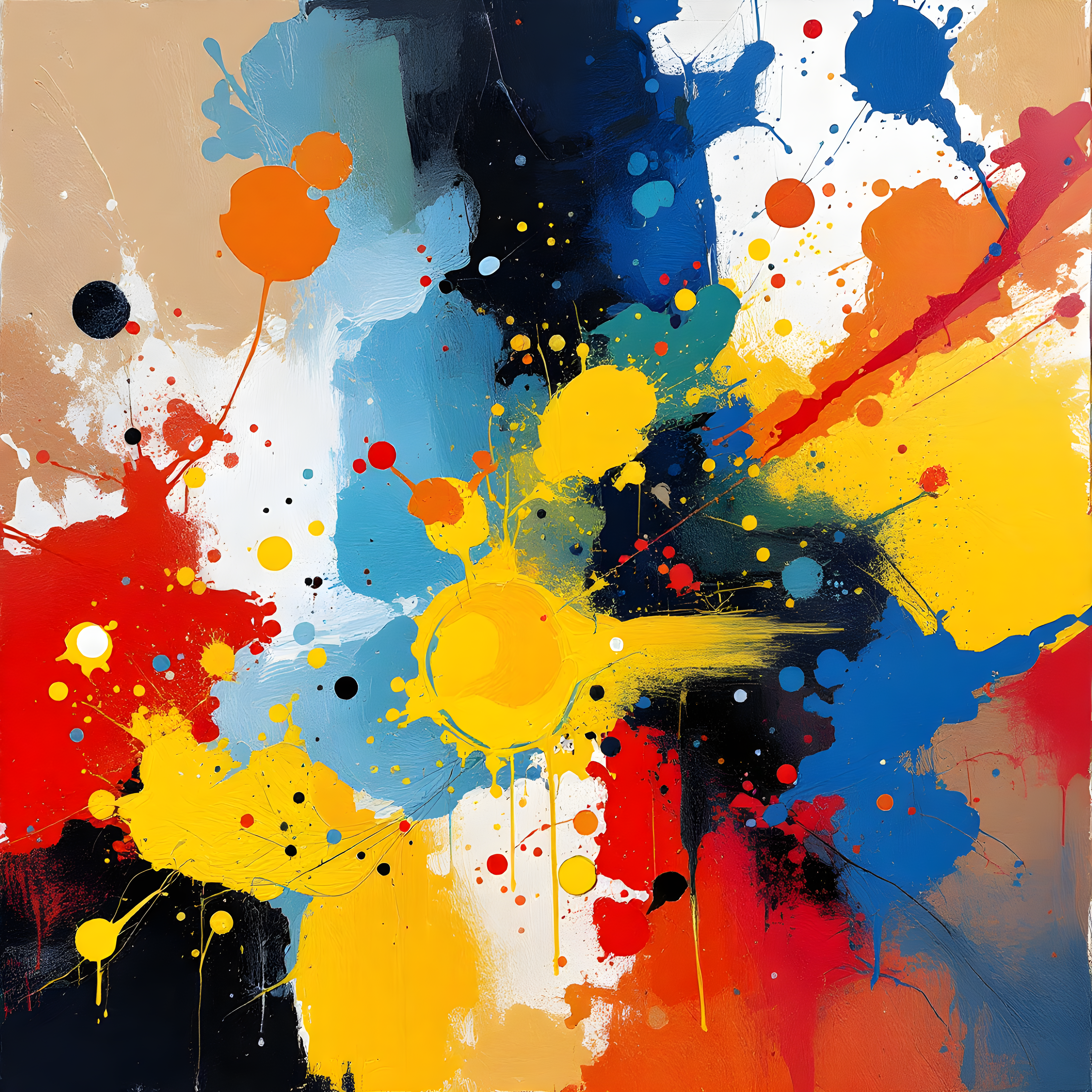 Over the remote Arctic Ocean, northwest of Greenland in the perpetual twilight zone, a dramatic weather system churns with surprising warmth for these latitudes. The low pressure system at 983.9 Pa creates heavy, saturated color pools that accumulate at the canvas edges, while the strong 16.4 m/s northerly wind drives explosive splatters and energetic bursts of pigment outward from concentrated areas. The unusually warm temperature anomaly of 17.4K above normal transforms what could be muted arctic tones into vivid, saturated hues—cadmium reds and ultramarine blues that pulse with unexpected life against the high humidity's soft, bleeding edges.