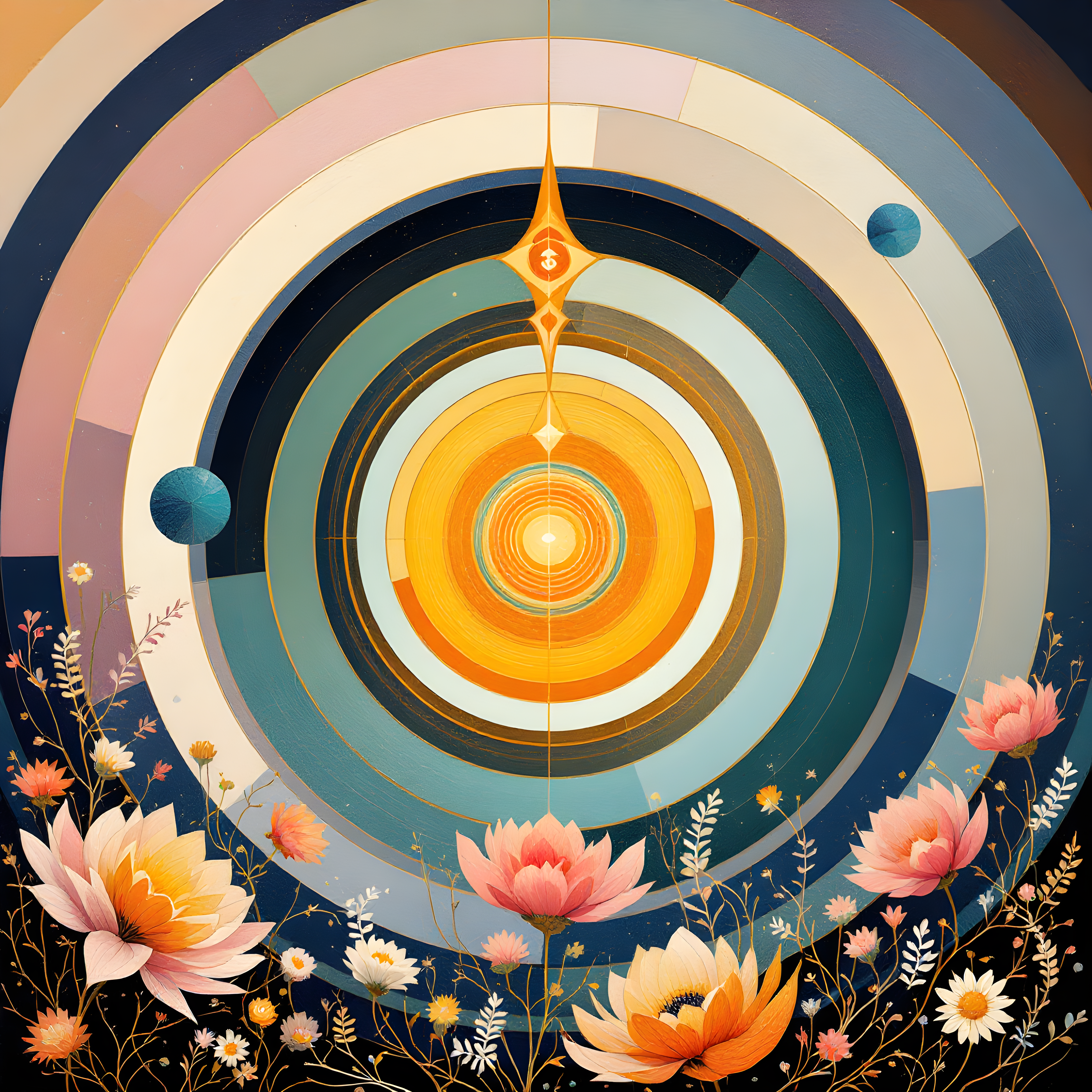 Over central China, near the convergence of the Yangtze River basin and the subtropical highlands, extremely low atmospheric pressure creates an almost mystical void that demands large, encompassing sacred geometries to fill the spiritual vacuum. The very cold temperature of 16.2 K shifts the palette entirely toward ethereal pastels - soft roses, powder blues, and sage greens - while the extraordinary 95% humidity transforms these forms into flowing, organic botanical shapes that seem to breathe and pulse with life. The gentle northwesterly wind at 1.8 m/s creates open, meditative spirals that unfurl slowly across the canvas like prayer wheels turning in mountain air.