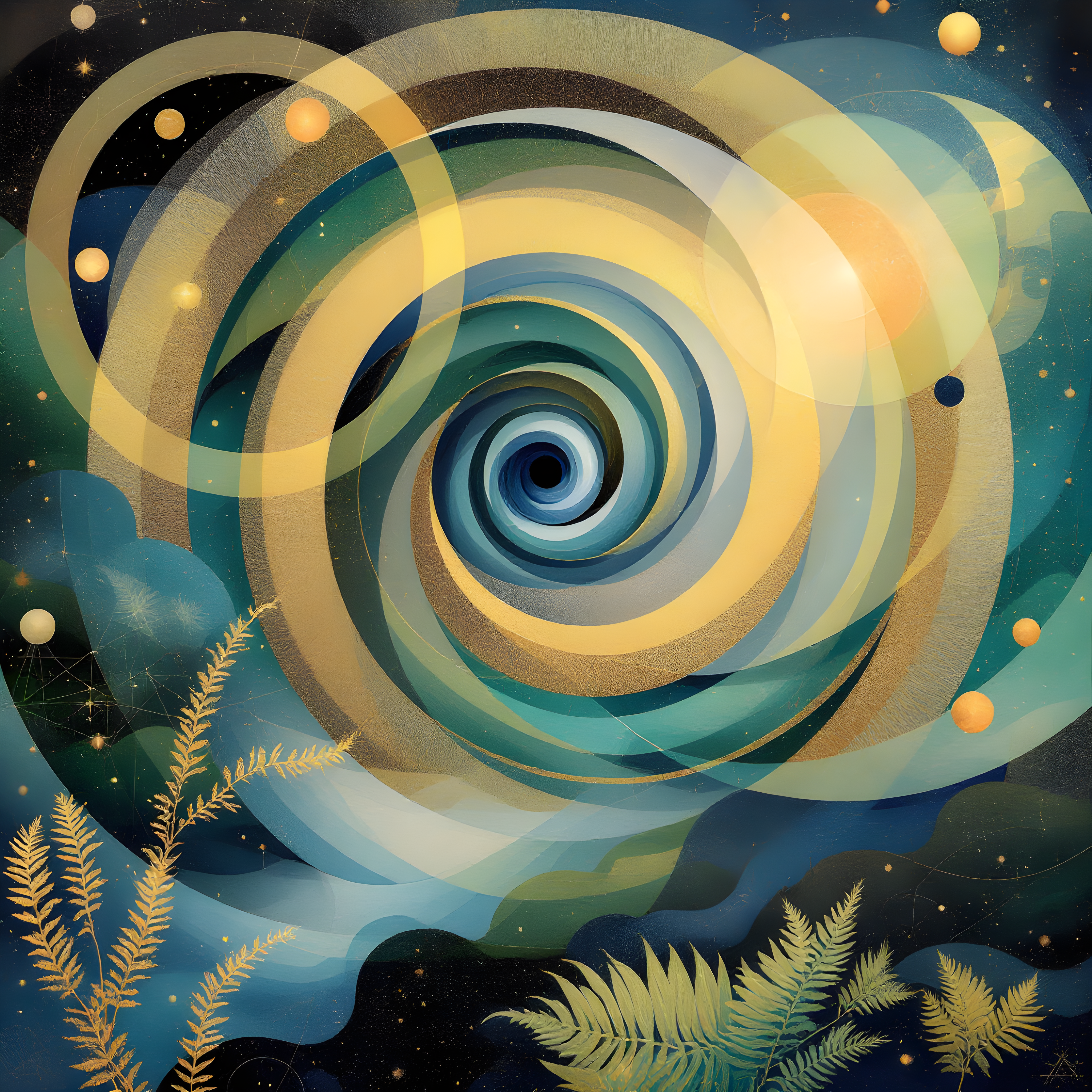 Over the Southern Ocean southeast of the Kerguelen Islands, where sub-Antarctic waters churn beneath dramatic skies, moderate pressure systems create sweeping atmospheric spirals. The cold temperature of 9.1K calls forth Hilma af Klint's ethereal pastels—soft rose, powder blue, and sage—while the moderate humidity of 63% shapes flowing botanical forms that undulate like kelp forests beneath the waves. The westerly wind at 13.7 m/s from 264 degrees generates clockwise spirals of medium tightness, creating sacred geometric patterns that echo both the Coriolis effect and ancient mandala forms.