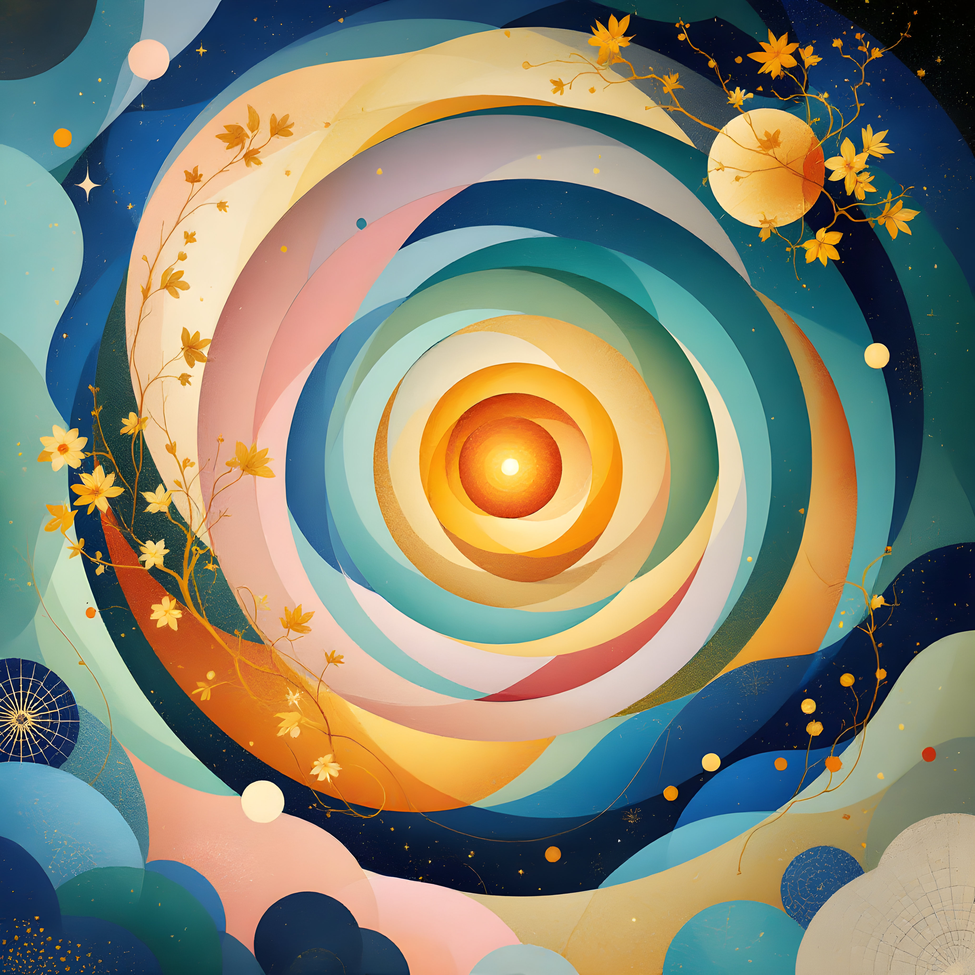 Over the warm waters of the western Pacific, southeast of Japan in the tropical convergence zone, atmospheric forces gather in gentle but persistent patterns. The moderate sea-level pressure of 1005.2 Pa with its significant gradient creates expansive sacred circles that pulse outward like ripples on water, while the northwest wind at 10.5 m/s guides these forms into loose, flowing spirals that suggest both cosmic movement and oceanic currents. The remarkably warm temperature anomaly of 14.3K above normal transforms the palette toward deep saturated jewel tones - ultramarine blues of the deep ocean, emerald greens of tropical abundance, and golden ochres of divine light - while the high humidity of 78% softens all edges into biomorphic, botanical forms that seem to breathe and grow like living mandalas.