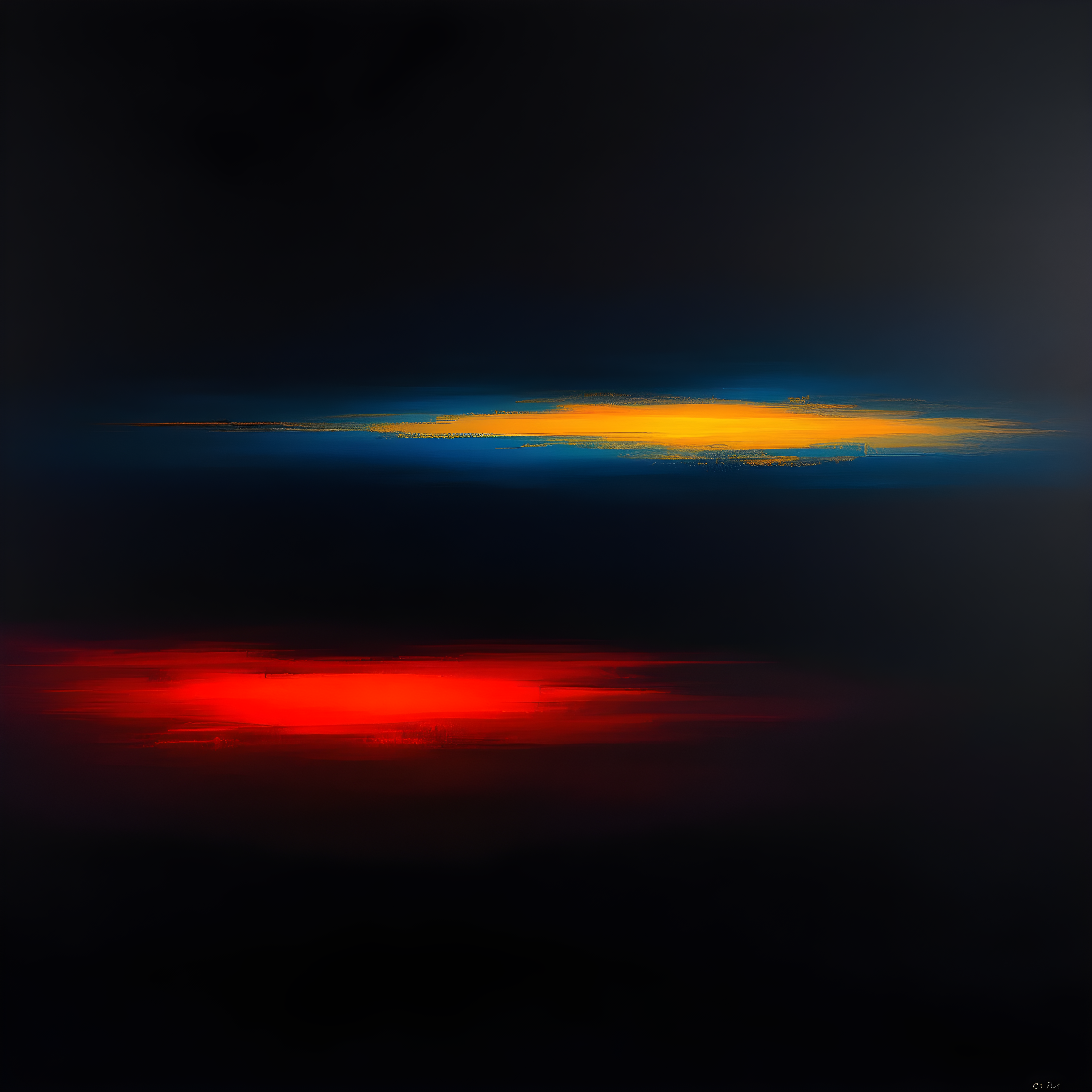 Over the Canadian Arctic archipelago in the remote Beaufort Sea region, where winter darkness meets scattered ice floes, the atmospheric data reveals an intensely cold but humid environment with gentle winds and low pressure. The extreme cold temperature of -6.2 K drives a palette of deep blues and blacks reminiscent of Rothko's most contemplative periods, while the high humidity of 93% creates an inner luminosity that makes these dark colors seem to glow from within. The low pressure suggests two heavy color bands that dominate the canvas, with the gentle 1.3 m/s wind creating soft, breathing edges between the forms.