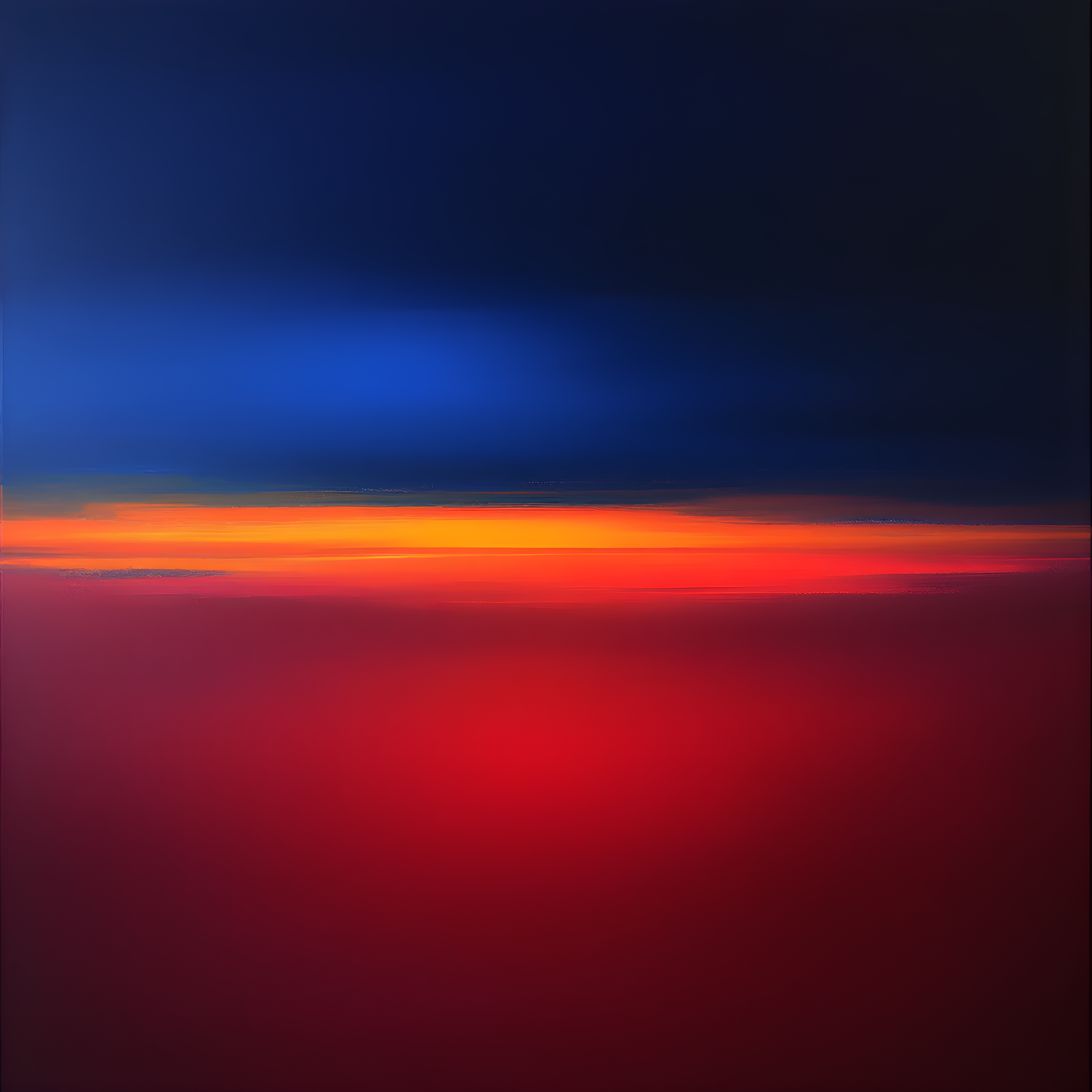 Over the high Andes of Peru and Bolivia, where the thin mountain air creates extreme atmospheric conditions, this scene captures a moment of intense cold at high altitude with very low pressure and high humidity creating an otherworldly environment. The bitter cold temperature of 5.5 K drives deep blues and blacks reminiscent of Rothko's most contemplative period, while the extremely low pressure creates just two massive color fields that seem to press against each other with gravitational weight. The high humidity of 90% makes these dark bands glow with an inner luminescence, as if lit by starlight in the rarified mountain air, while the gentle wind softly blurs the boundaries between the color fields.