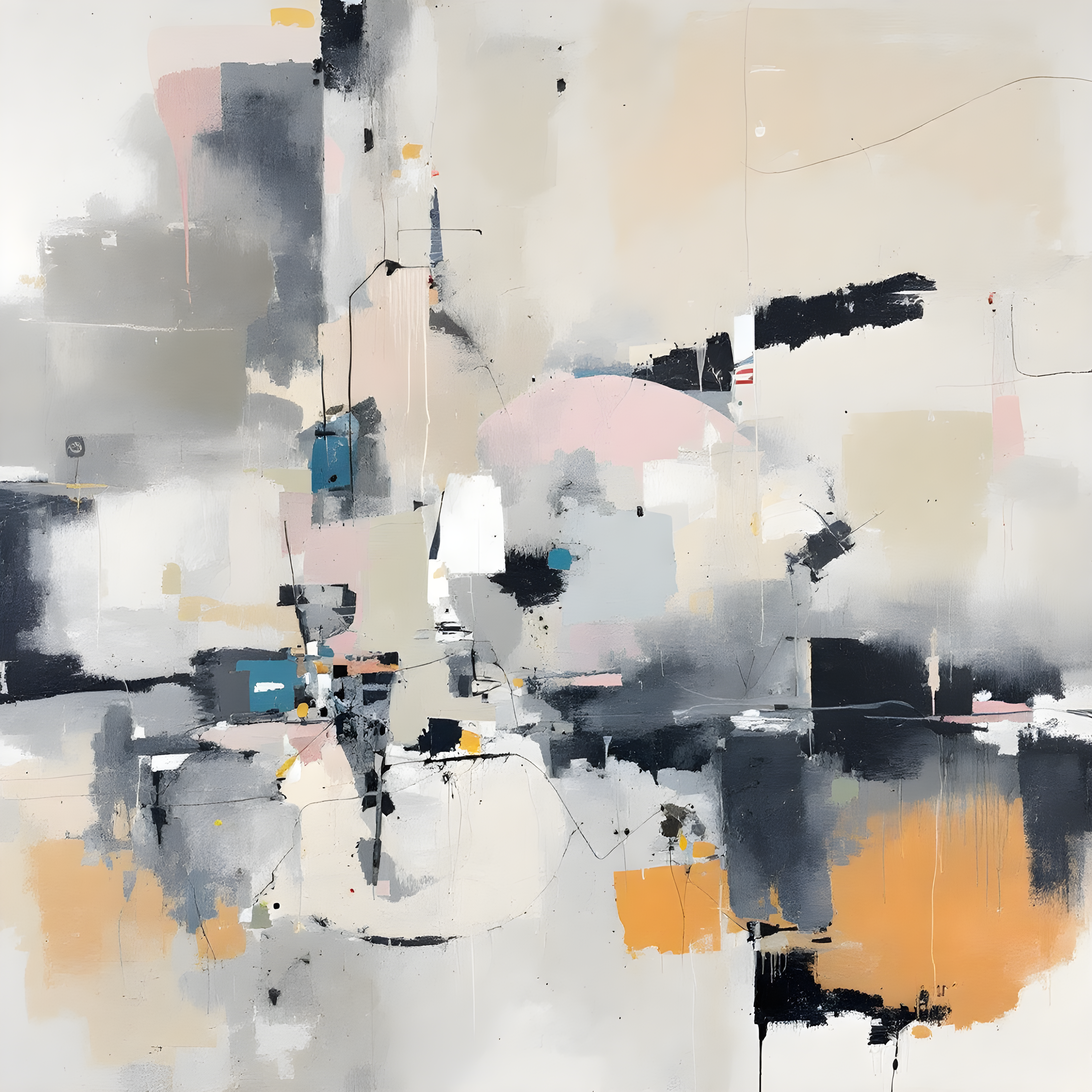 Over the Arctic Ocean north of central Siberia, where pack ice meets the relentless polar wind, a significant temperature anomaly of 17.7K creates dramatic atmospheric instability. The moderate pressure gradient and high humidity suggest layers of moisture-laden air moving through this remote region, while light precipitation adds temporal marks to the frozen landscape. This unusual warmth in such an extreme location translates into a heavily worked composition where fragments of geometric structure emerge from beneath aggressive, scraped-back layers—the temperature anomaly driving chaotic marks that break through more contemplative stratifications, while the high humidity allows deep palimpsest layers to show through translucent veils of weathered paint.