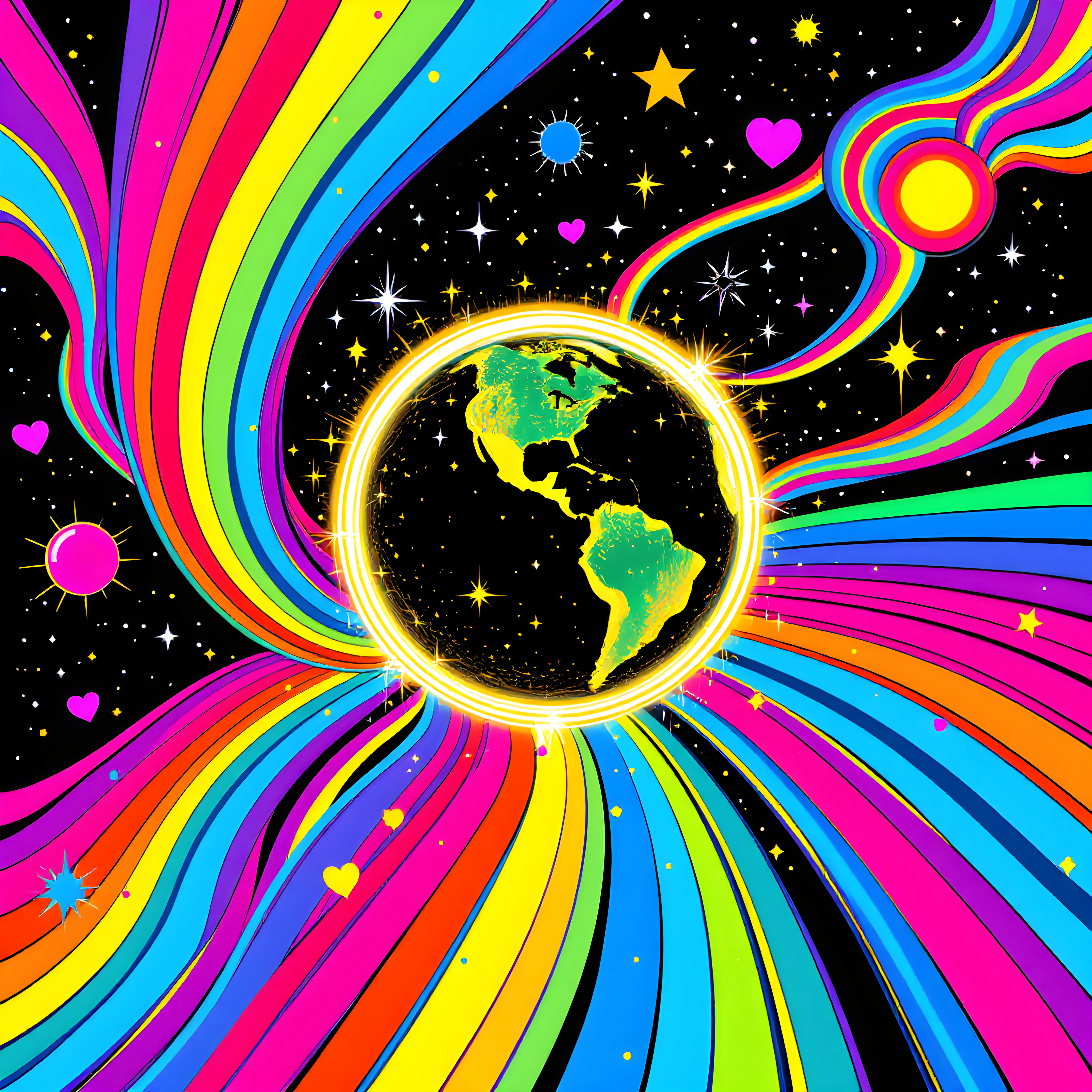 This arctic landscape floats over the frigid waters between Greenland and Baffin Island, where high pressure creates a dense cosmic energy field packed with neon forms crowding the portrait canvas. The bitter cold temperature drives an electric palette dominated by cobalt blues, cyans, and UV violets, while the gentle 3.5 m/s wind creates modest rainbow arcs that sweep horizontally across the composition rather than spanning the full height. The high humidity of 78% generates intense glowing halos around the radiant Earth orb and scattered cosmic hearts, making every neon form pulse with blacklight intensity against the deep space backdrop.