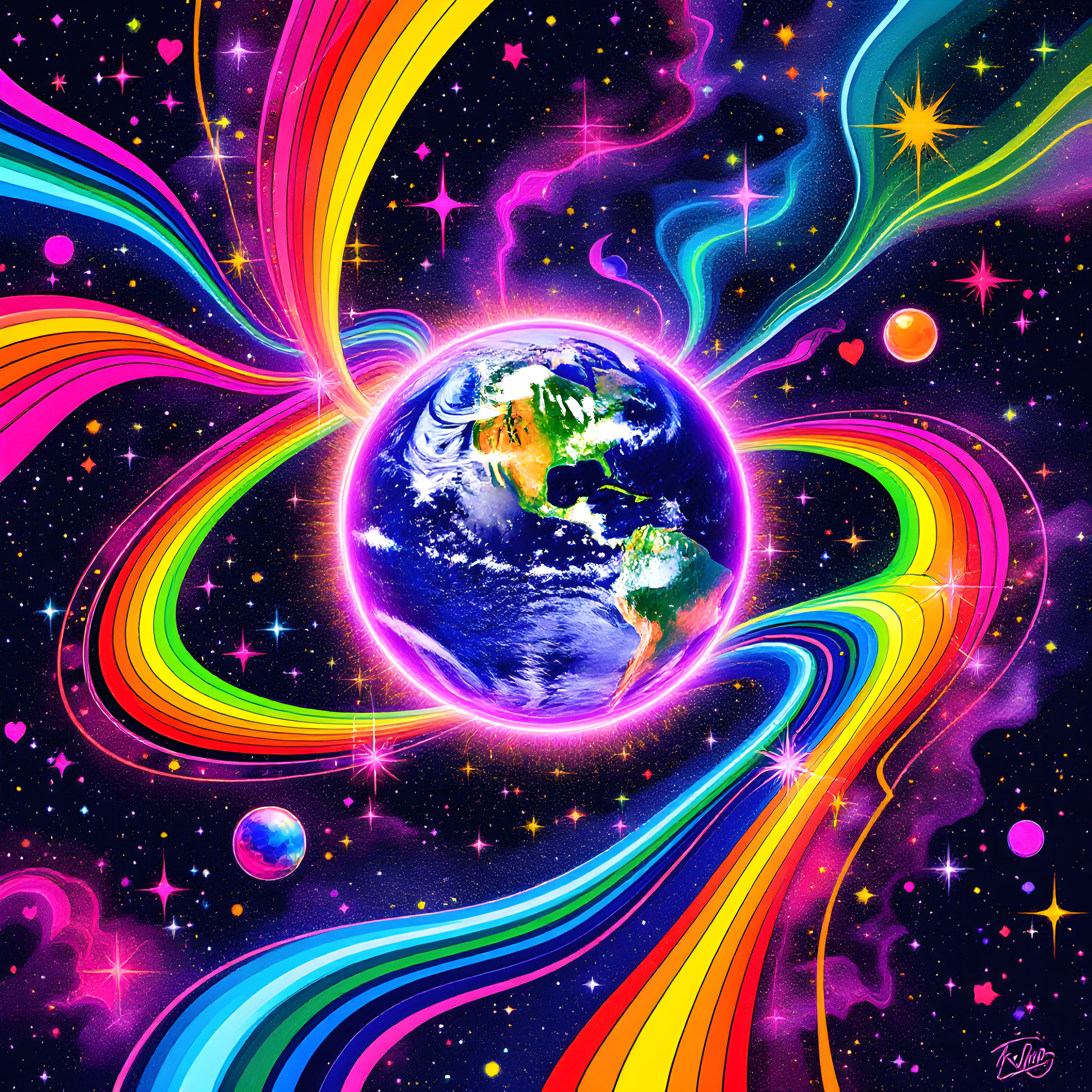 Over the Arctic Ocean northwest of Iceland, where frigid waters meet the polar atmosphere, the high pressure system creates a cosmic compression effect while the near-freezing temperature and extreme humidity generate an ethereal glow. The moderate southwest wind sweeps neon rainbow arcs across this polar landscape, while the zero precipitation keeps the starfield clear and vibrant. I've interpreted this dense, humid Arctic atmosphere as a tightly packed neon cosmos where electric blues and cyans dominate the cold palette, with the high pressure manifesting as densely clustered cosmic forms and the high humidity creating intense halos around every celestial body.