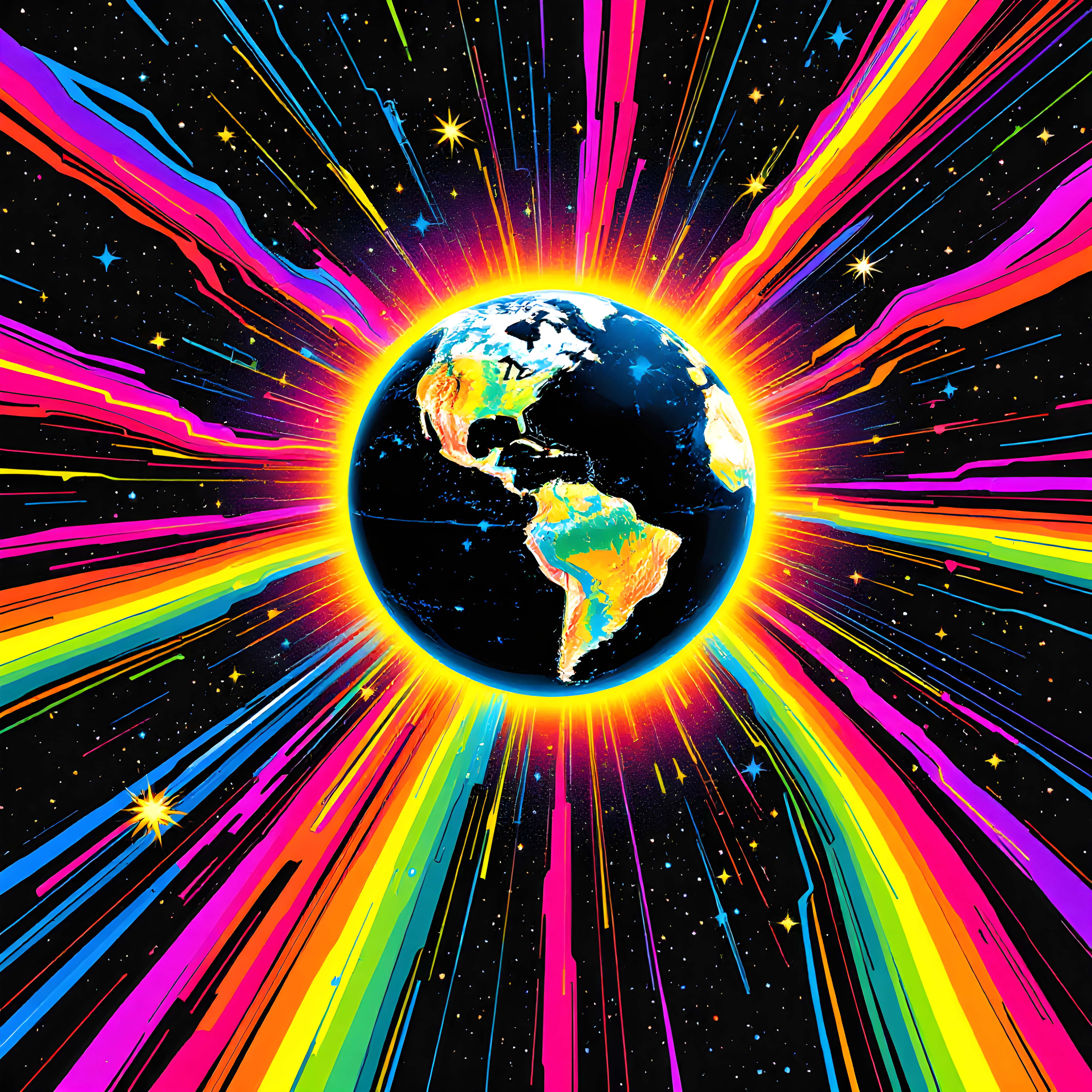 Over the Western Pacific at 15°N 160°E, we're floating above the vast tropical waters between Hawaii and the Philippines, where warm trade winds sweep across endless blue. The moderate pressure of 1012.5 Pa creates a balanced cosmic density with the glowing Earth orb surrounded by expansive starfields but filled with vibrant neon energy. The warm 26.5K temperature (with its significant positive anomaly) ignites hot magentas and electric yellows throughout the composition, while the 7.4 m/s wind from the northeast drives rainbow arcs sweeping diagonally across the canvas with flowing neon contrails. The high 79% humidity creates an intense radiating glow around all celestial bodies, and the light precipitation adds cascading rivers of liquid neon streaming through the cosmic scene.