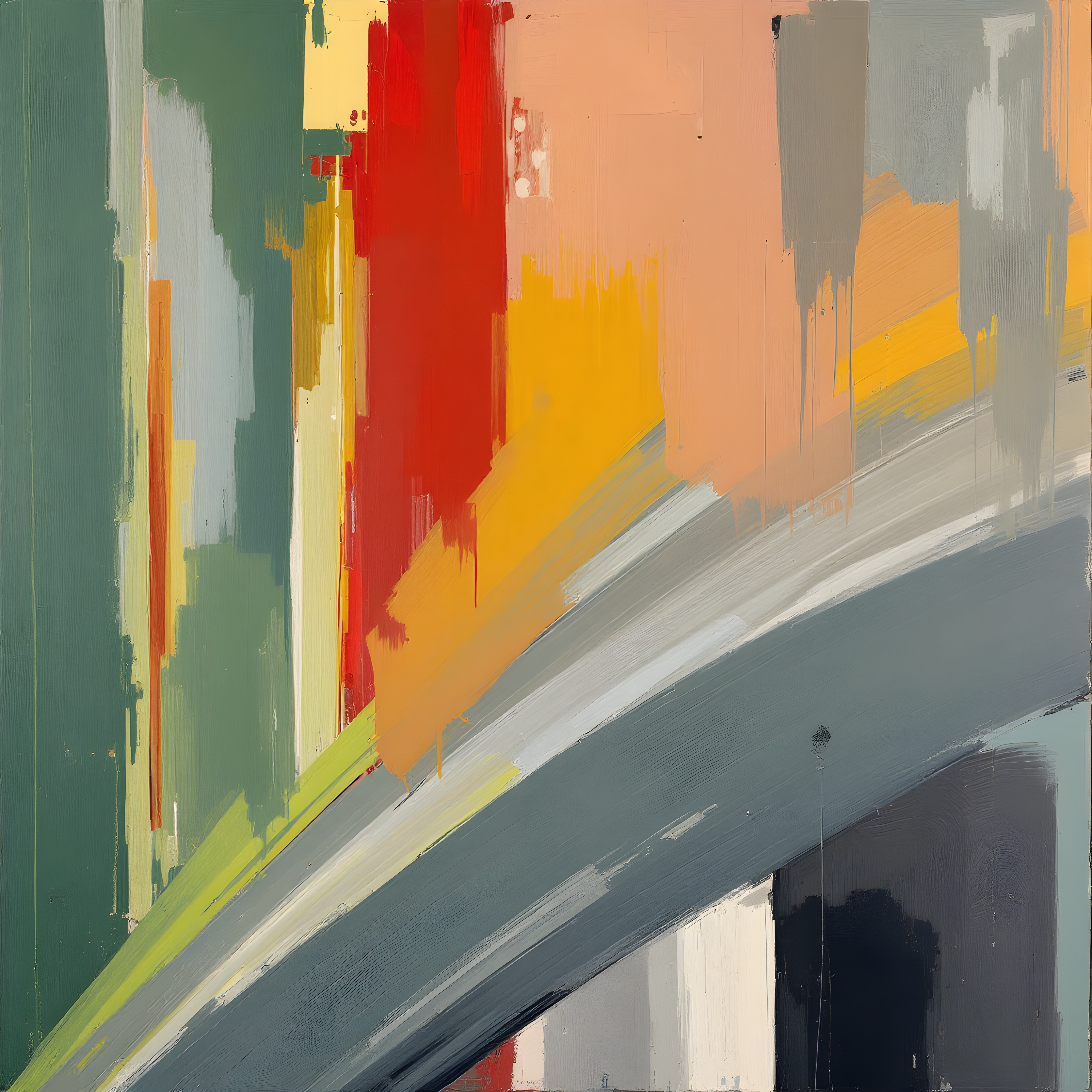 Over the Southern Ocean near the Antarctic Peninsula, where frigid waters meet volatile atmospheric conditions, this location experiences dramatic weather with strong northwest winds and significant temperature anomalies. The low pressure system with steep gradients creates turbulent conditions, while high humidity and light precipitation add atmospheric density to this remote maritime environment. I've interpreted this through Richter-inspired layered paint drags, where the northwest wind drives diagonal sweeping strokes from upper-left to lower-right, the steep pressure gradient reveals multiple color layers through complex overlapping, and the significant temperature anomaly brings warm underlying colors breaking through cooler surface tones.