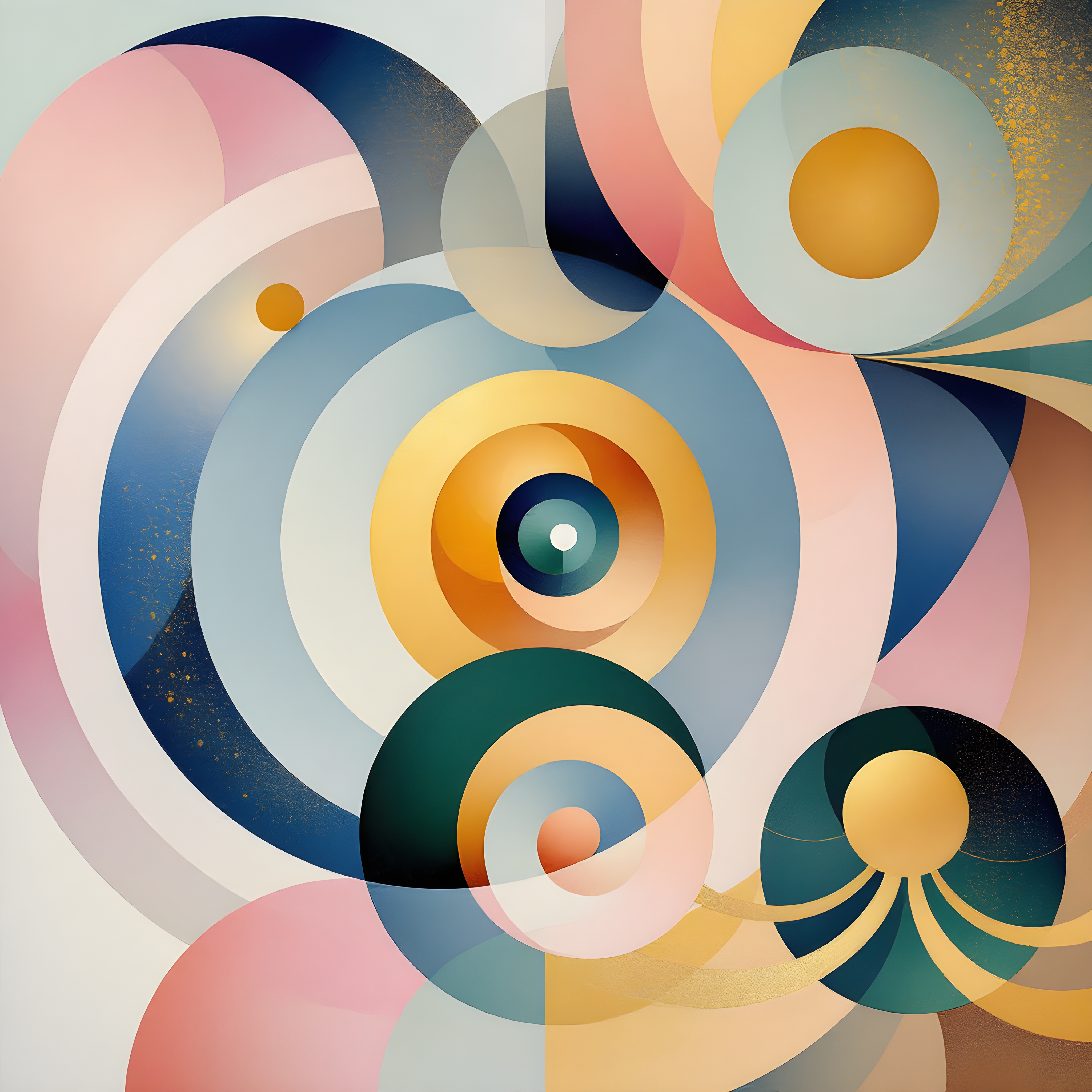 Over the Norwegian Sea in the Arctic Ocean, where the Greenwich meridian meets the 60th parallel north, high pressure creates a dome of atmospheric stillness above the icy waters. The extreme cold of 7.3 Kelvin drives this composition into Hilma af Klint's ethereal pastel realm, with soft rose and powder blue dominating the sacred geometry, while the high pressure manifests as large, encompassing circles and gentle spirals. The moderate northwest wind at 4.6 m/s creates loosely wound spirals that drift across the canvas, and the high humidity of 82% encourages flowing, botanical forms that seem to breathe with organic life despite the arctic setting.