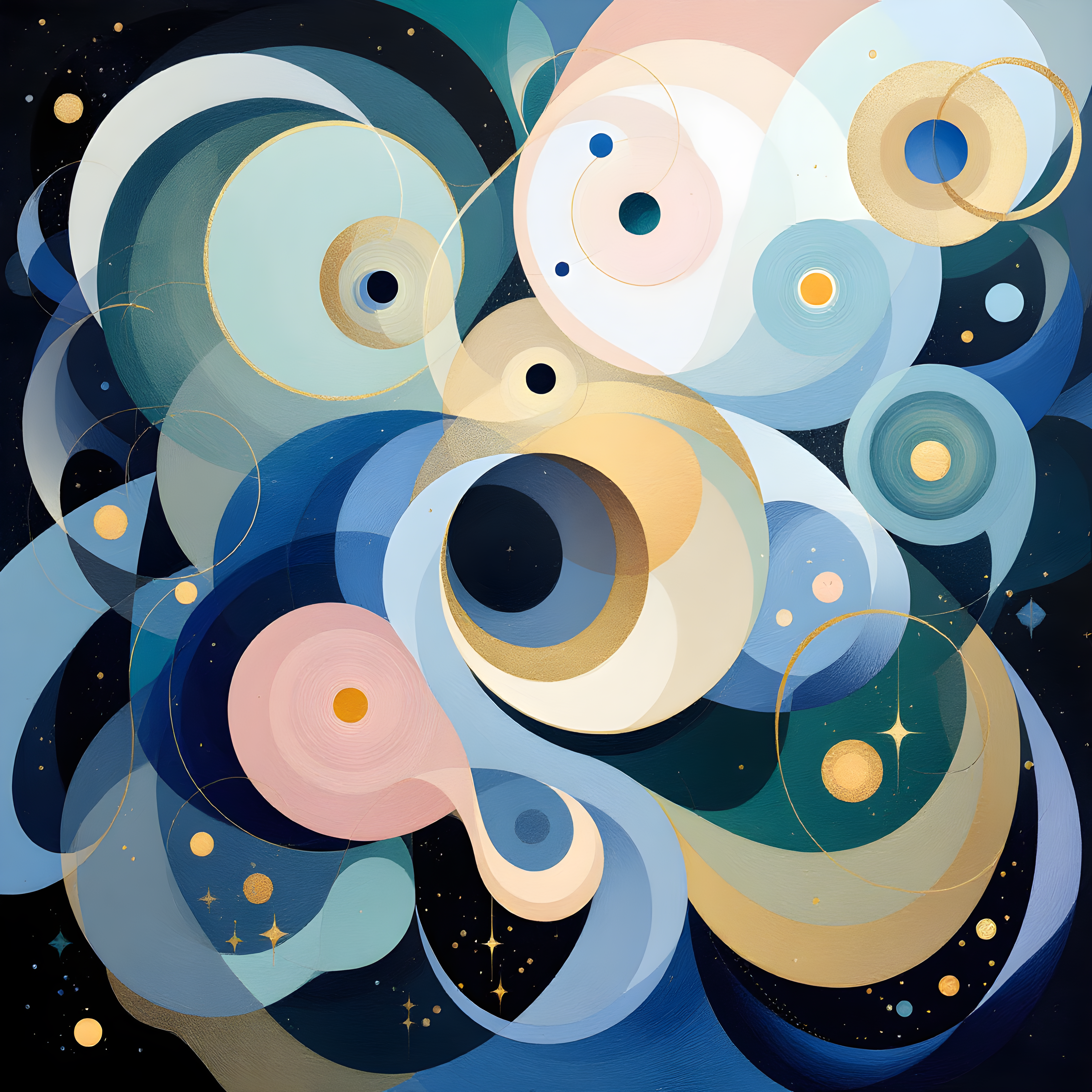 Over the Siberian Arctic Ocean northeast of the Urals, where sea ice meets endless tundra, the atmosphere holds a mystical stillness. The nearly saturated air and gentle western winds create flowing, organic forms, while the relatively high pressure manifests as large encompassing circles and sacred geometric patterns. The cold temperature calls forth soft pastels and ethereal tones, with the high humidity translating into botanical, biomorphic shapes that seem to breathe and pulse with Arctic life force.
