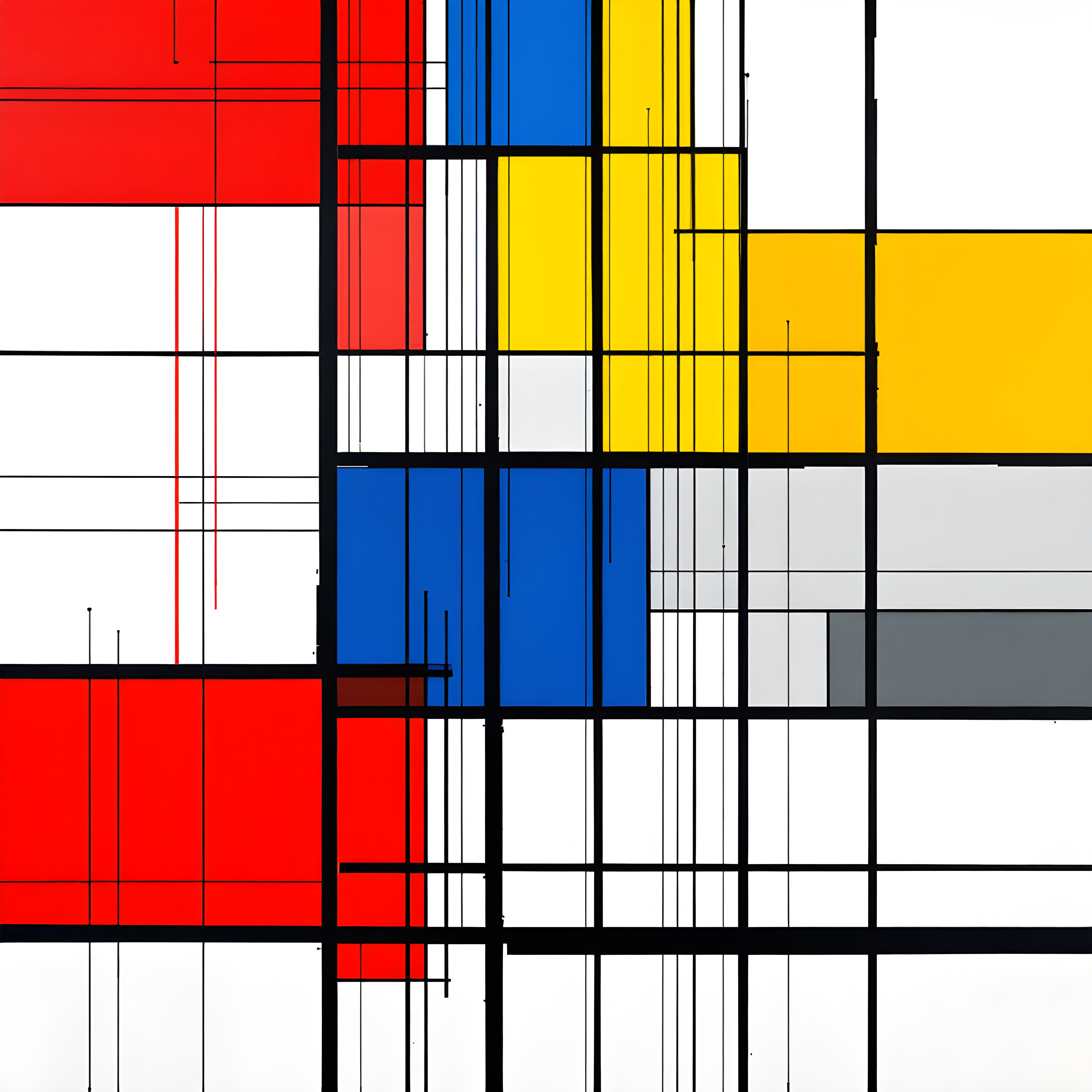 This location sits over the Arabian Sea near the southern coast of Pakistan and western India, where warm ocean waters meet the monsoon influence. The high pressure gradient of 35.35 Pa/cell creates a dense network of black dividing lines forming smaller rectangular cells, while the moderate temperature of 27K with its positive anomaly shifts the composition toward yellow dominance with strategic red accents. The strong westerly wind at 7.7 m/s from 248 degrees creates a heavily asymmetric composition weighted toward the right side, and the high humidity of 85% translates into bold, thick black lines that create dramatic geometric divisions across the canvas.