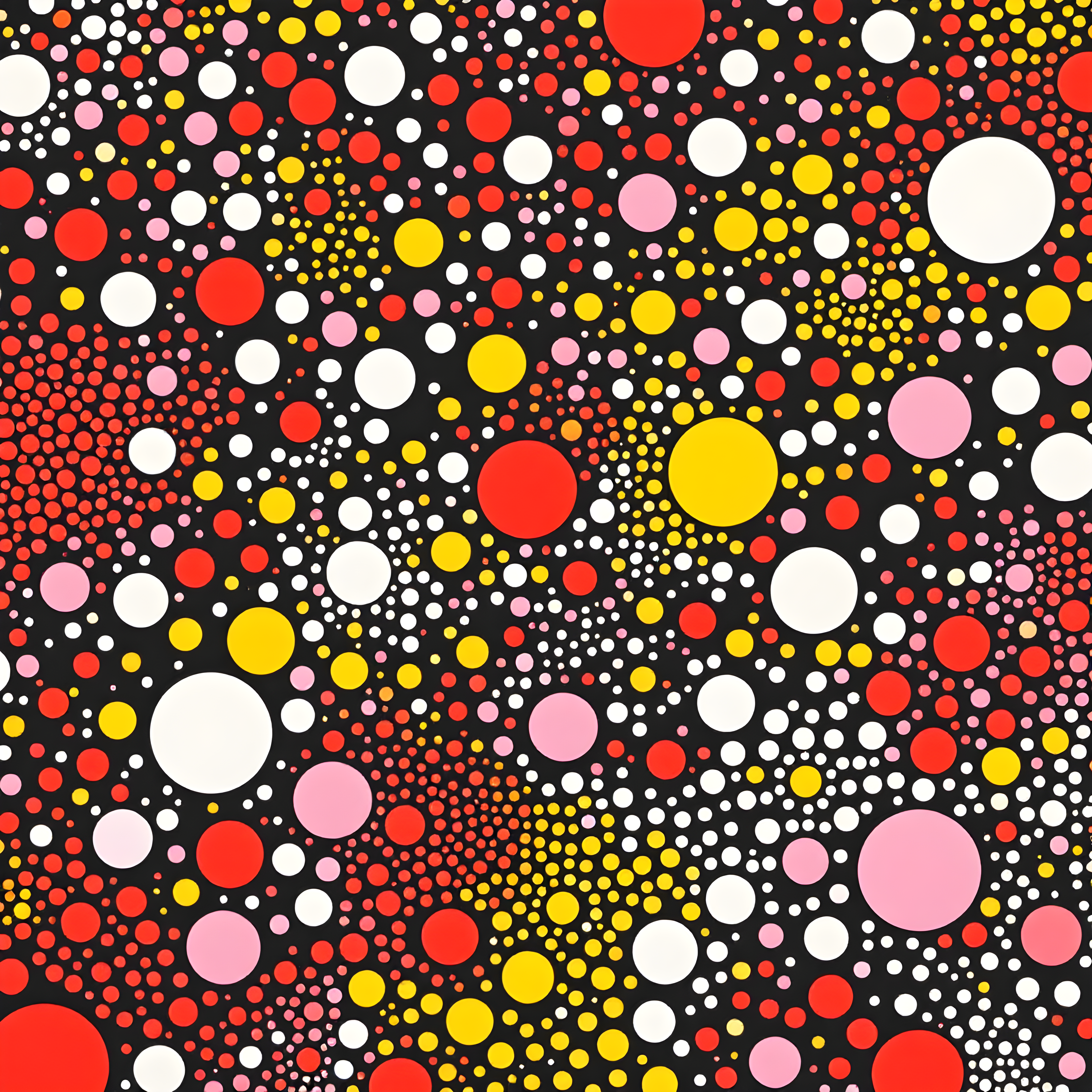 Over the Tasman Sea southeast of Australia, where moderate winds of 8.8 m/s sweep across waters under high pressure, the atmospheric conditions create a vision of cosmic expansion and rhythmic repetition. The significant pressure gradient of 46.44 Pa/cell translates into dramatic size variations in my dot patterns, while the moderate wind speed generates a medium-density field of circular forms that pulse across the canvas like celestial bodies in motion. The cool temperature anomaly and 65% humidity inspire a palette of vivid warm dots against deep contrasting backgrounds, creating the infinite net effect that suggests both oceanic vastness and cosmic infinity.