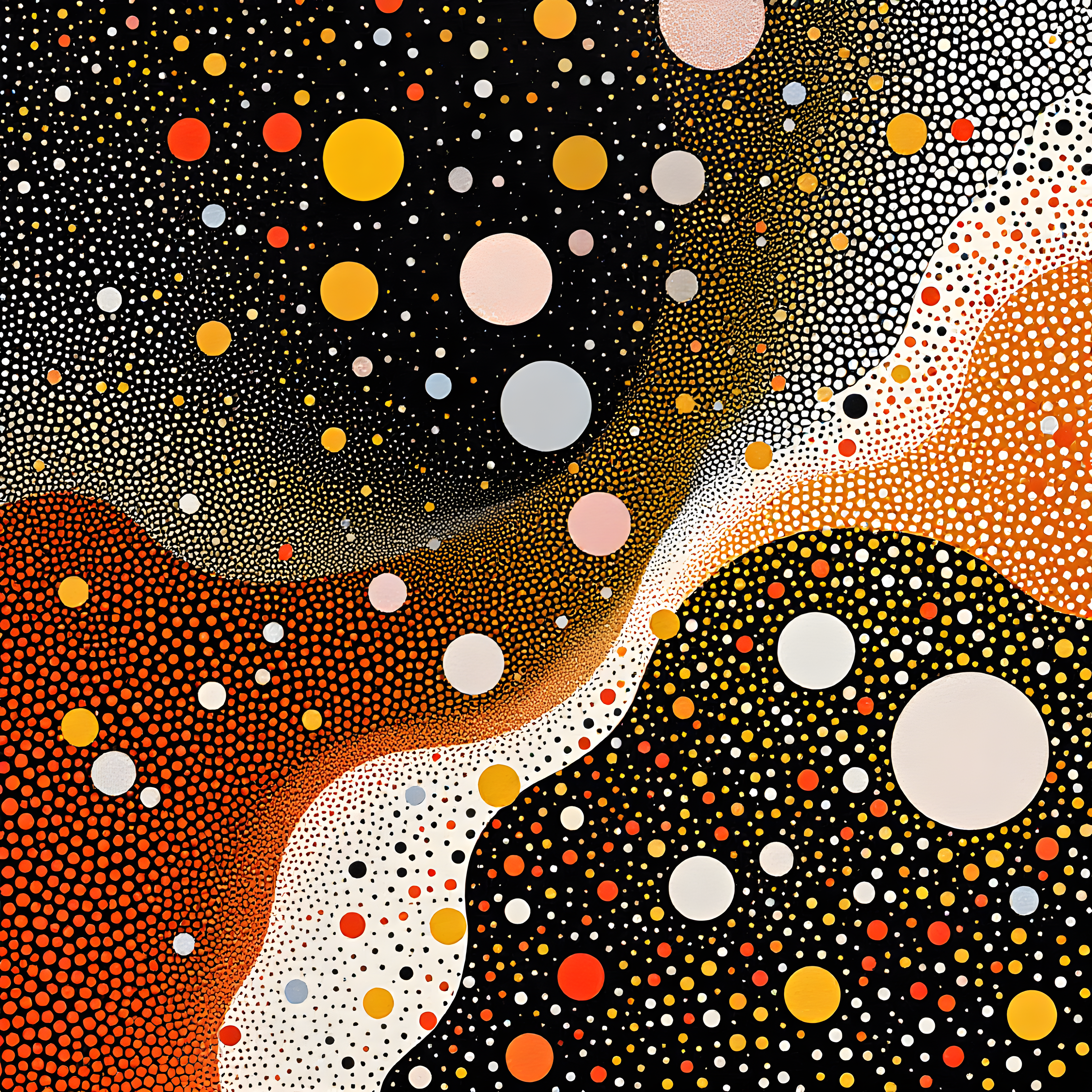 This artwork captures the high Andes mountains of Peru or Bolivia, where extreme altitude creates the dramatically low atmospheric pressure and frigid temperatures recorded in this data. The gentle northwest wind and high humidity suggest moisture-laden air moving across this stark landscape, while the absence of precipitation indicates the thin atmosphere's limited capacity to generate storms. I've interpreted these conditions through Kusama's cosmic vision: the extremely low pressure drives wide variations in dot sizes from microscopic to planetary, while the bitter cold manifests as silver and ice-blue dots floating against deep space black, with the high humidity creating dense constellation networks that suggest the infinite cosmos above these remote peaks.
